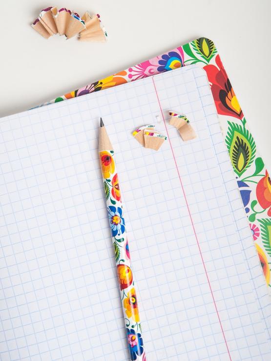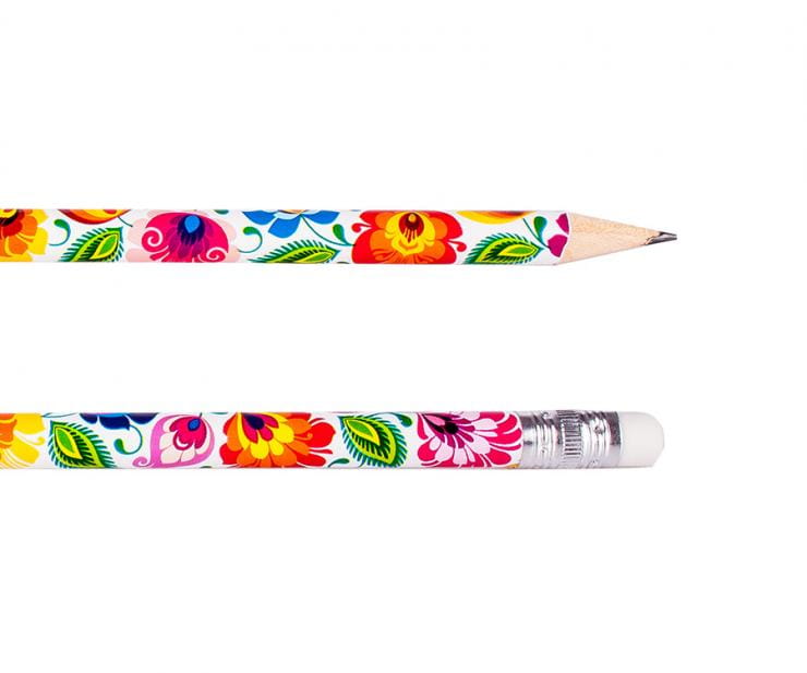 Biały folkowy ołówek ozdobiony kwiatami łowickimi to idealny prezent dla twojej pociechy. Wzór inspirowany jest najpopularniejszymi wycinankami ludowymi - łowickimi co sprawi, że w klasie wszyscy staną dęba. Nie tylko w klasie ale i w miejscu twojej pracy.