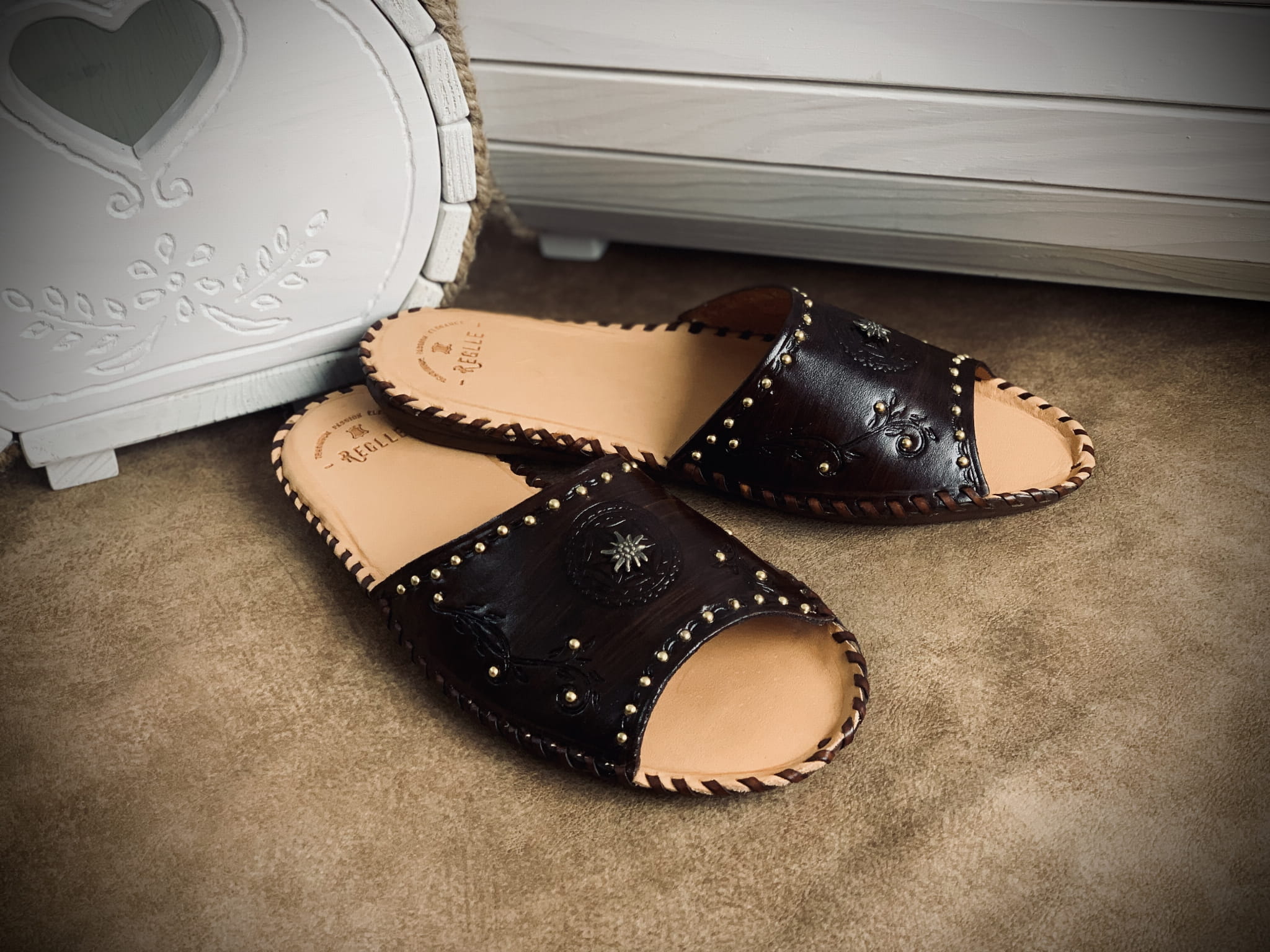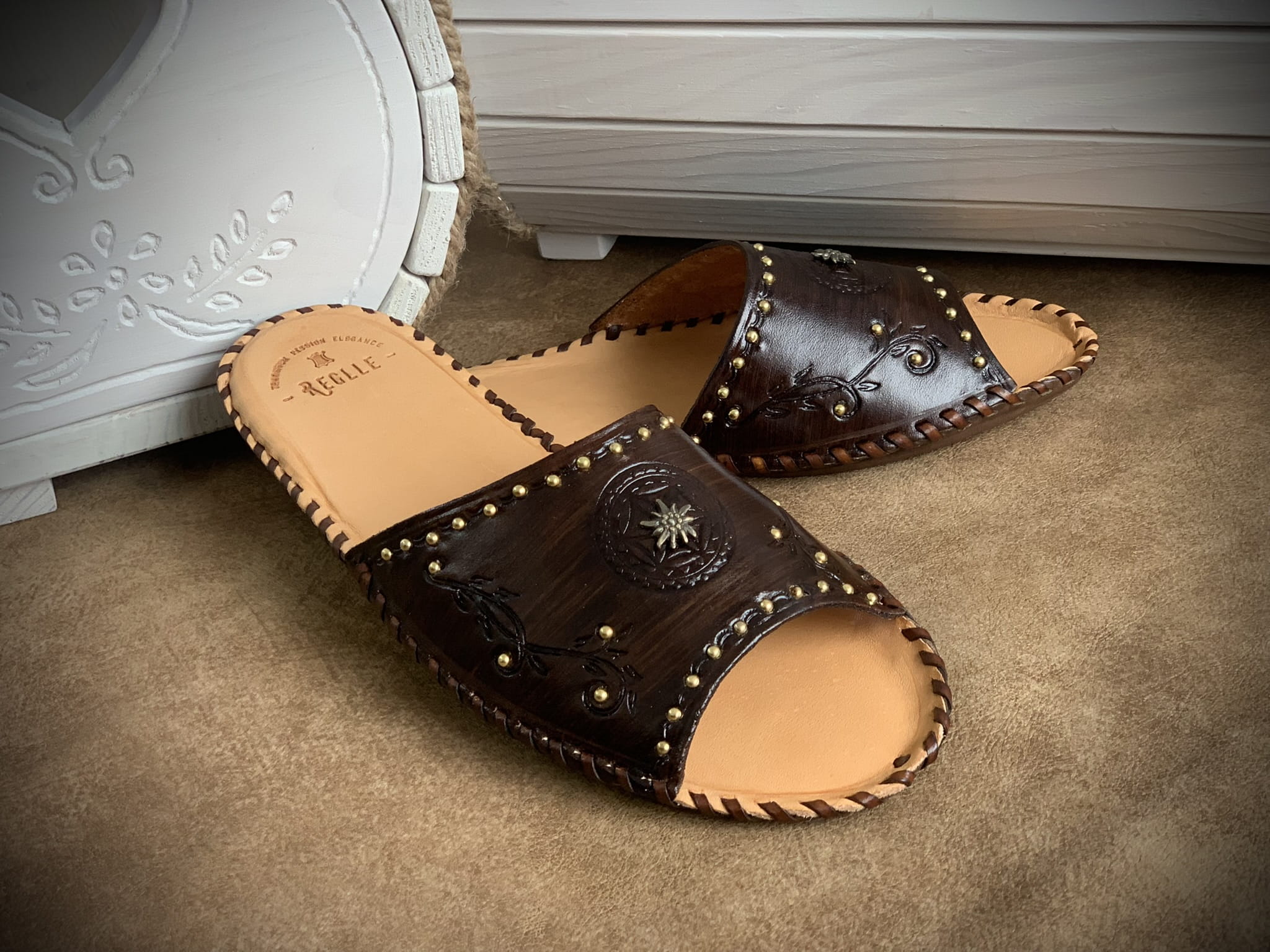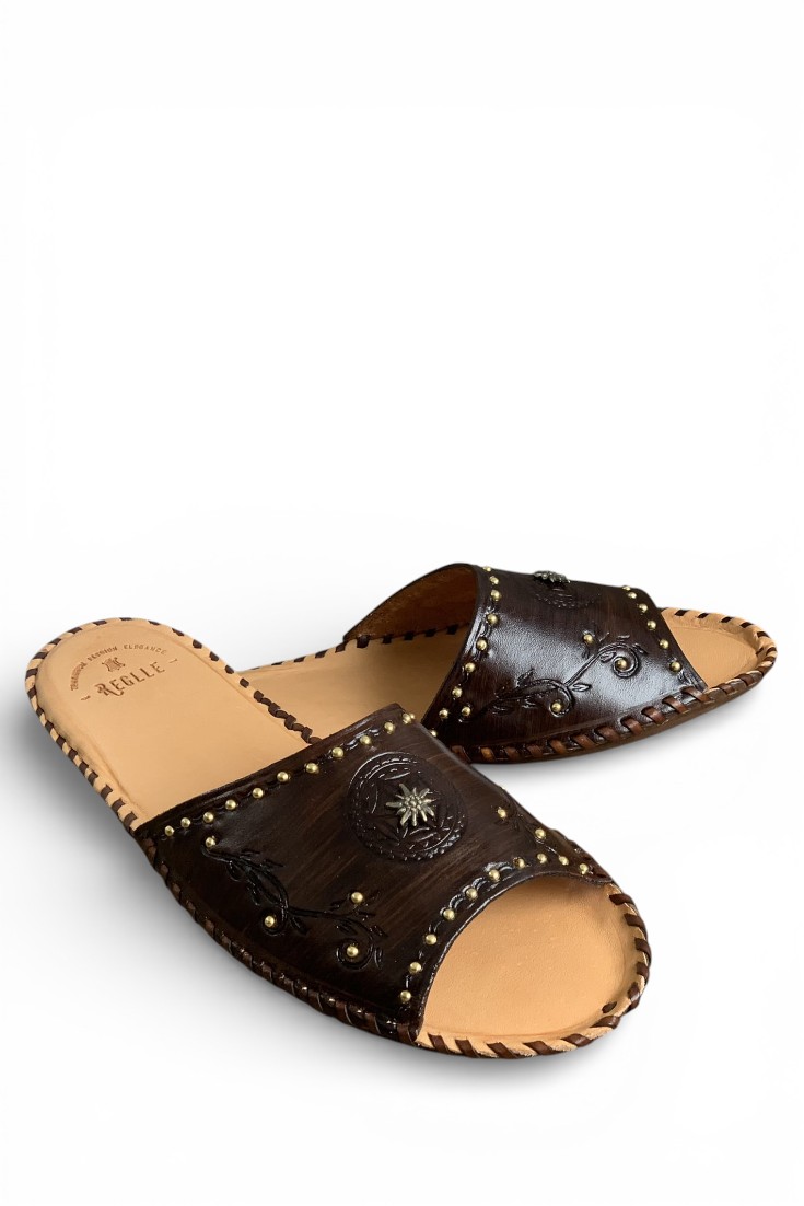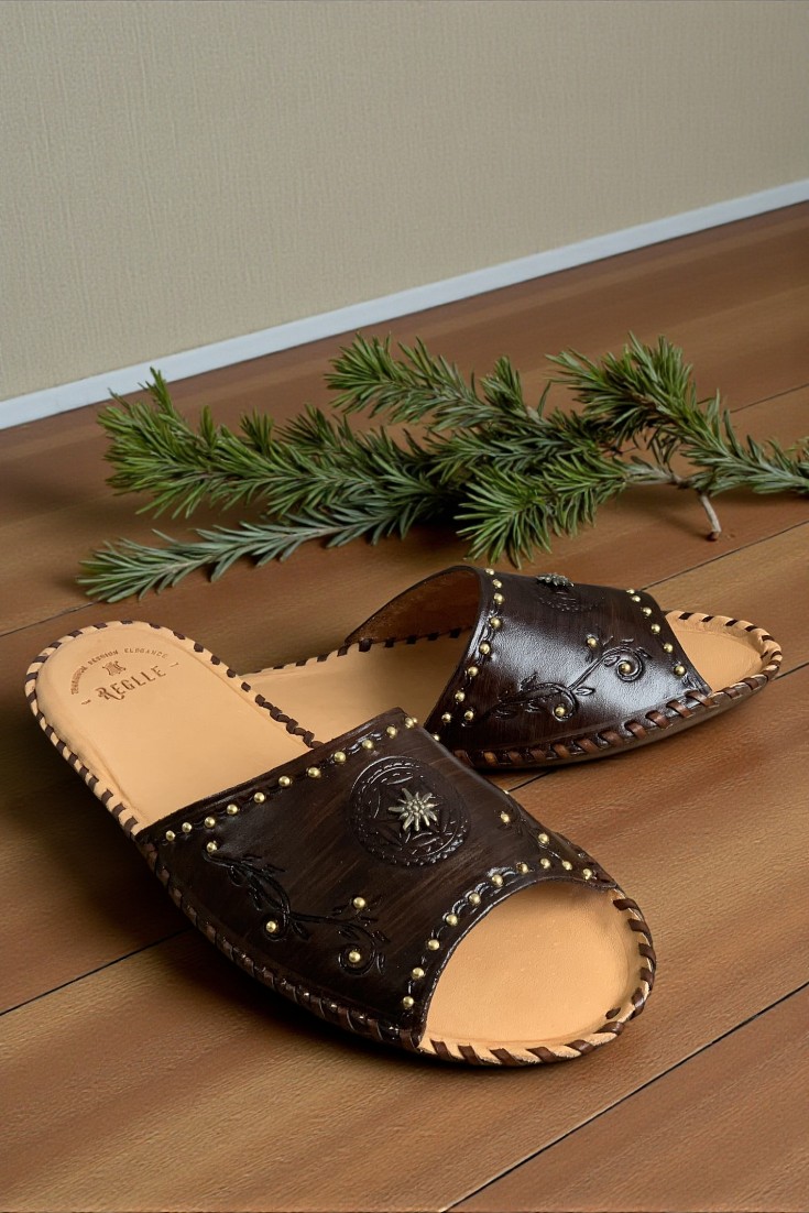 Damskie skórzane klapki góralskie zdobione