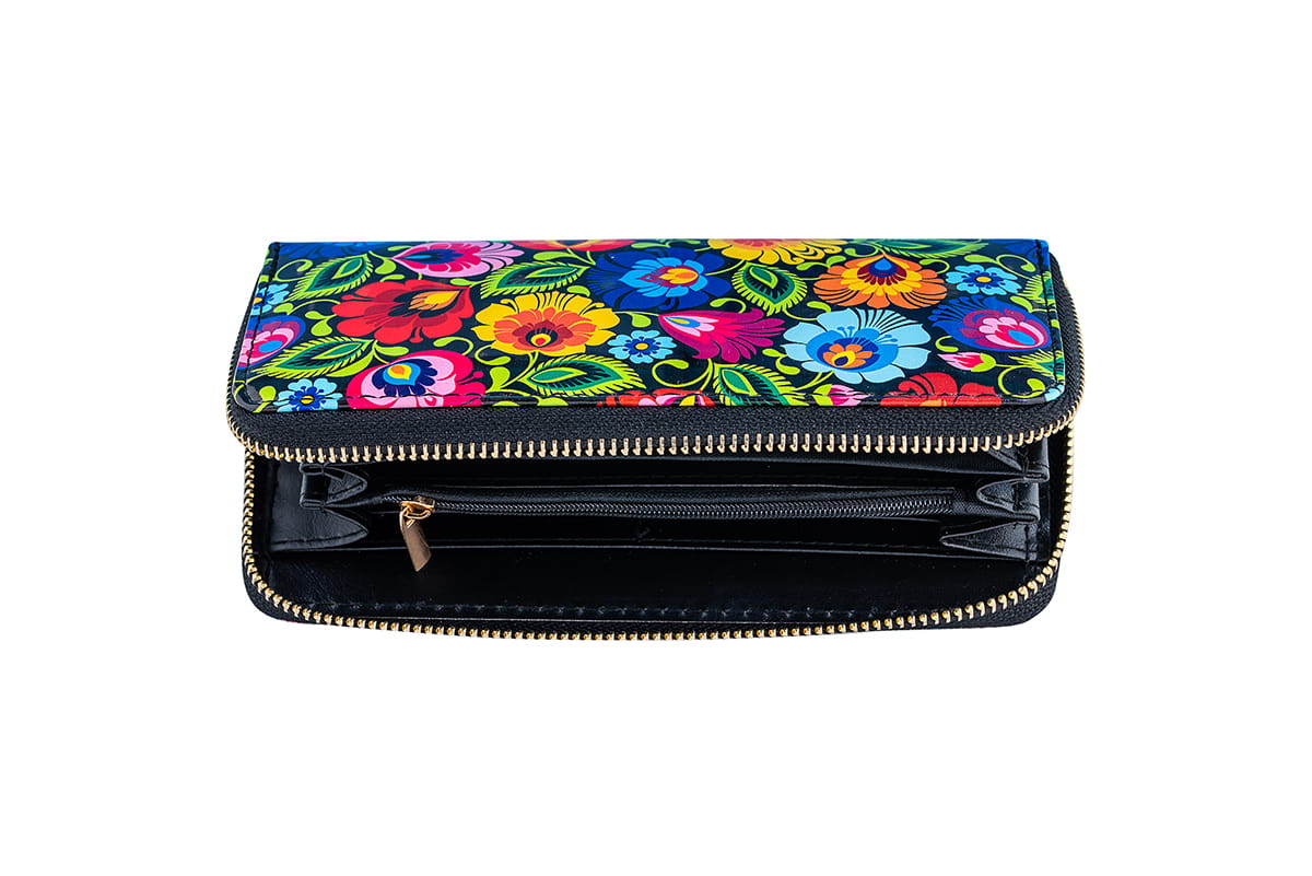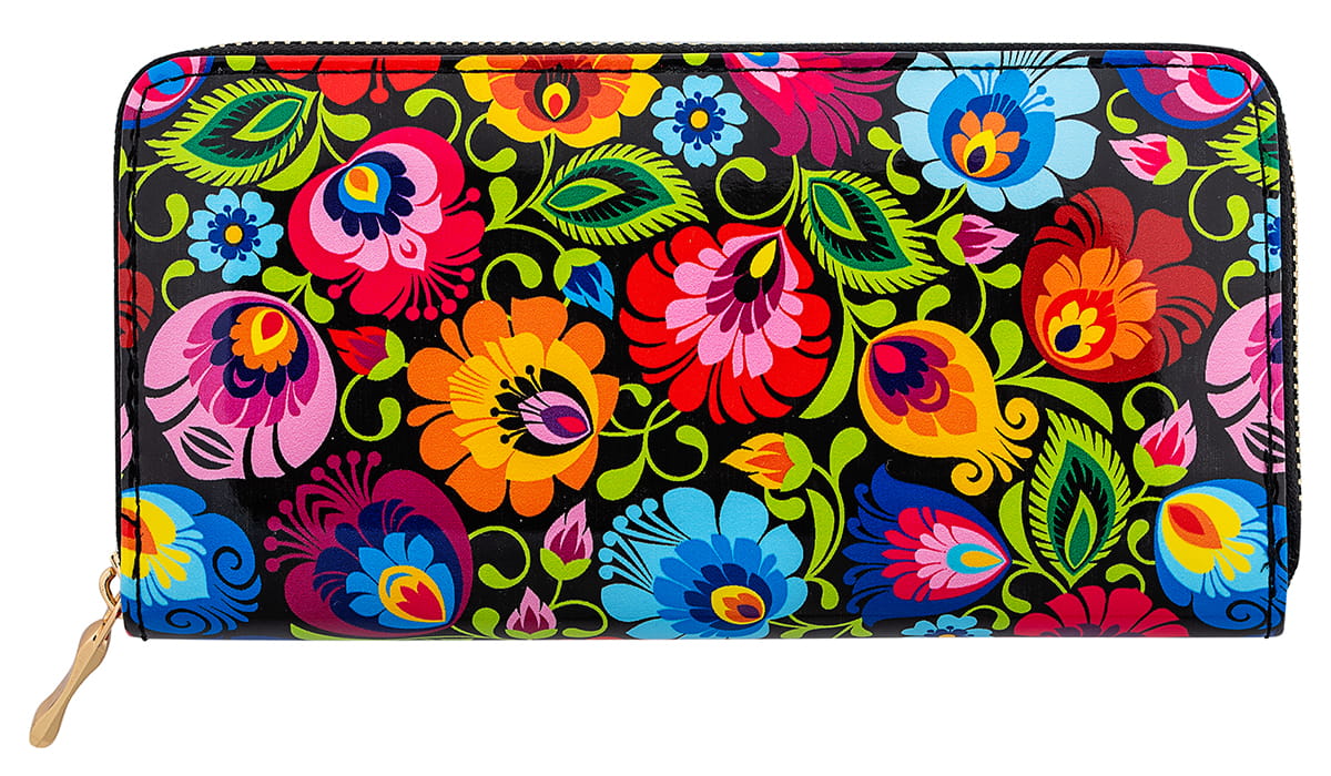 Duży folk portfel damski z nadrukowanym łowickim wzorem ludowym na czarnym tle. Motyw zdobiący ludowy portfel inspirowany jest tradycyjnymi wycinankami łowickimi - najbardziej rozpoznawalnym symbolem polskiego folkloru.