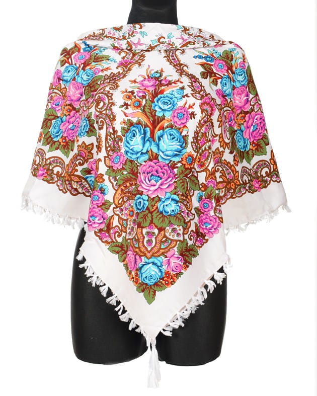 Folkowa chusta zdobiona pięknymi kolorowymi kwiatami. Chusta zdobiona krótkimi frędzelkami i została wykonana z bardzo przyjemnej tkaniny. Idealna na każdą porę roku.