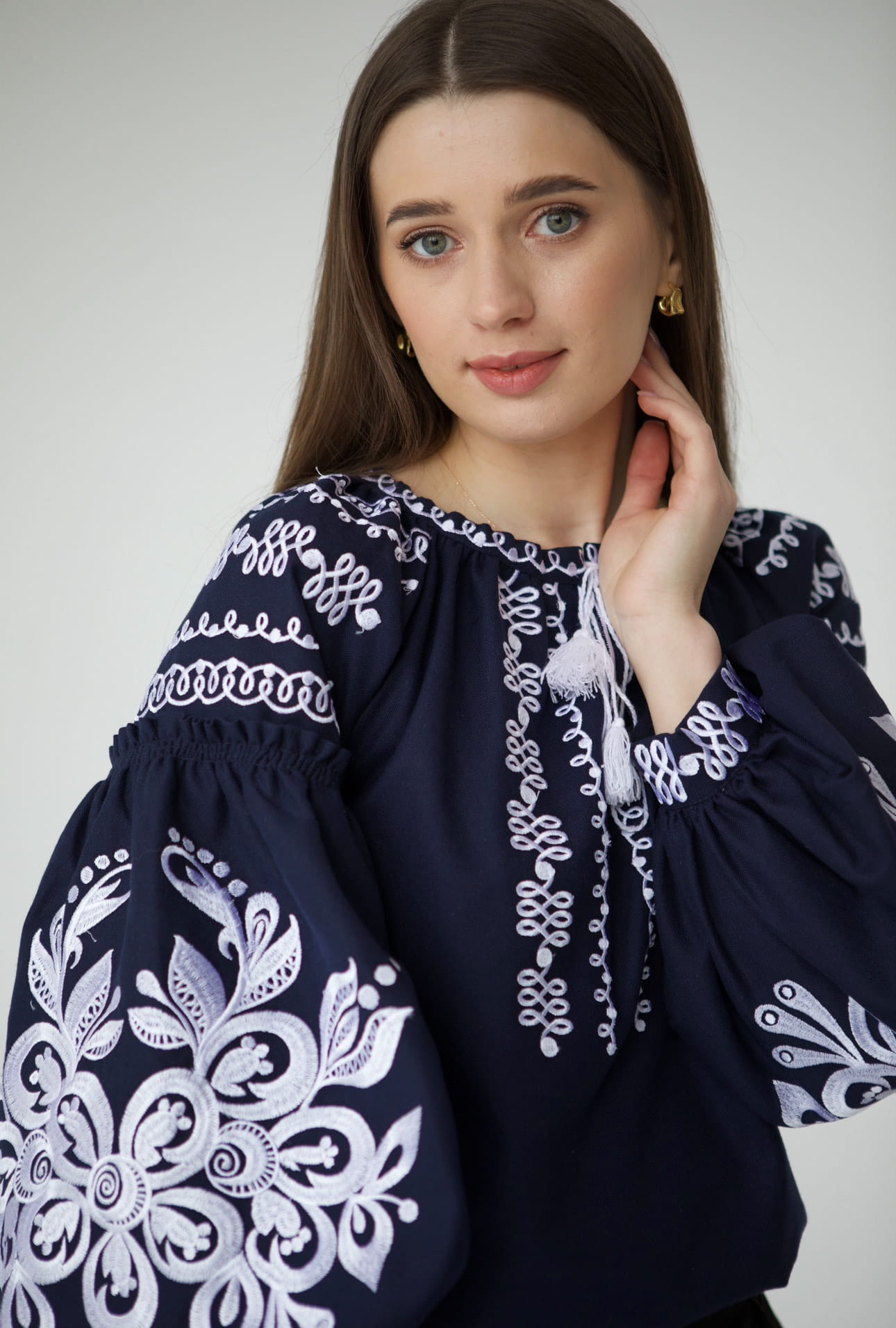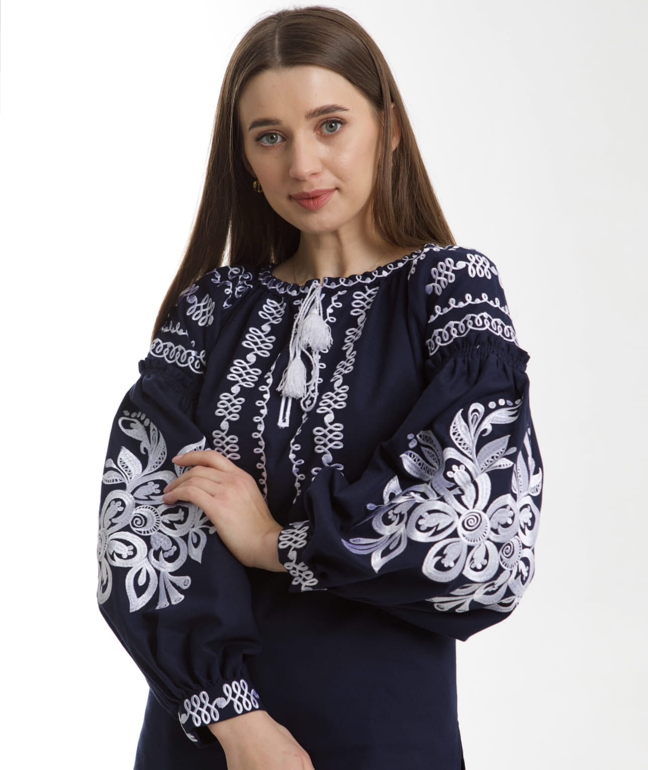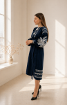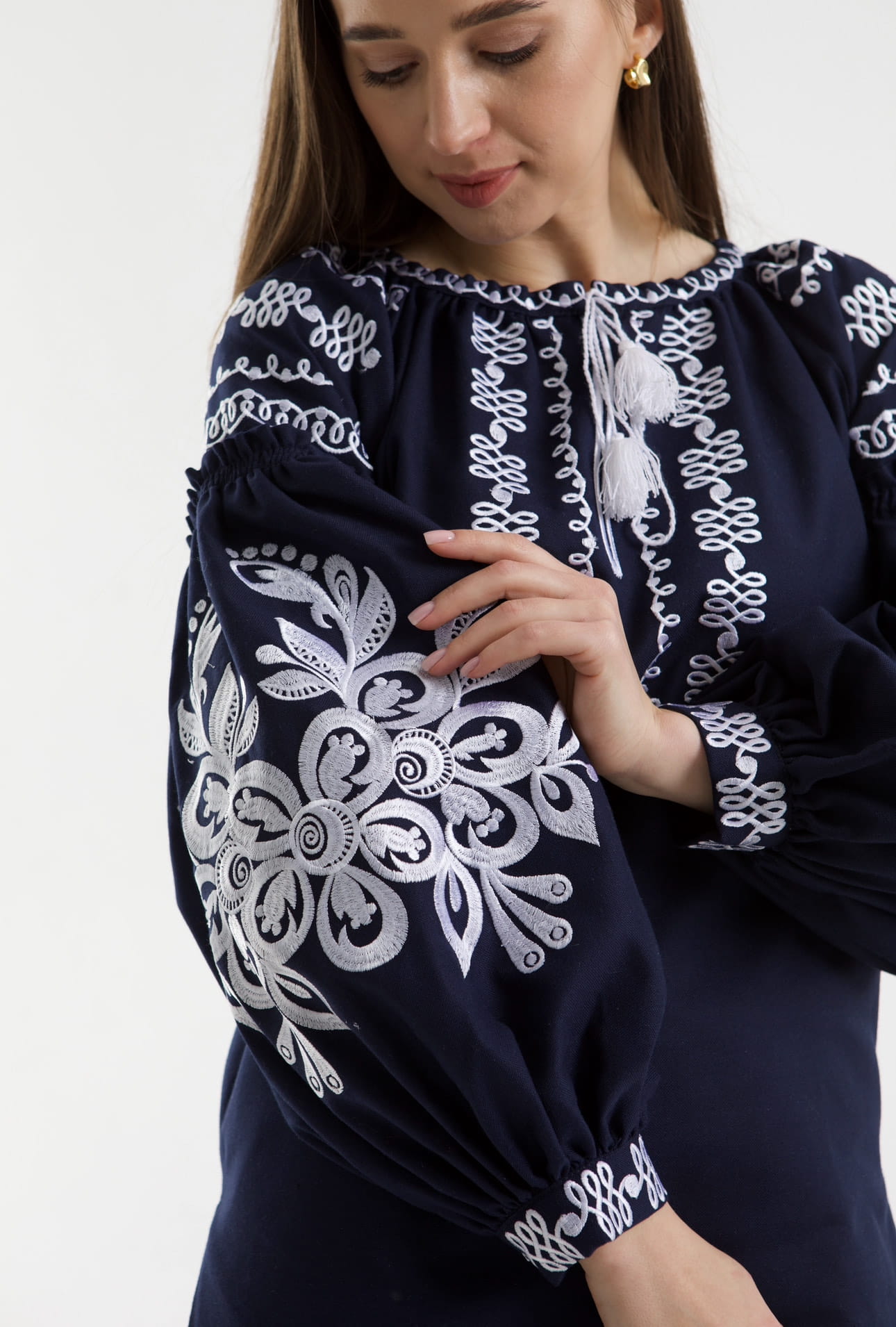 Stylowa i ponadczasowa sukienka wykonana z wysokiej jakości lnu i bawełny. Ozdobiona bogatym, maszynowym haftem inspirowanym tradycyjnymi motywami ludowymi. Dekolt zdobiony chwościkami, wiązana w pasie. Dzięki naturalnemu składowi materiału sukienka jest lekka, przewiewna i komfortowa w noszeniu. Doskonale sprawdzi się zarówno na co dzień, jak i podczas wyjątkowych okazji. To połączenie klasyki i folkloru w nowoczesnym wydaniu – idealne dla miłośniczek unikalnego stylu i rękodzielniczych detali.