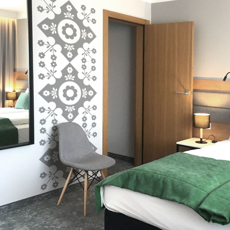 Szablon malarski przeznaczony jest do jednorazowego użytku i wykonany z samoprzylepnej folii transparentnej (przezroczystej). Bardzo dokładnie przylega do ściany, wykonane wzory są idealnie równe, bez najmniejszych zacieków.