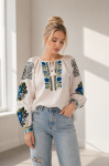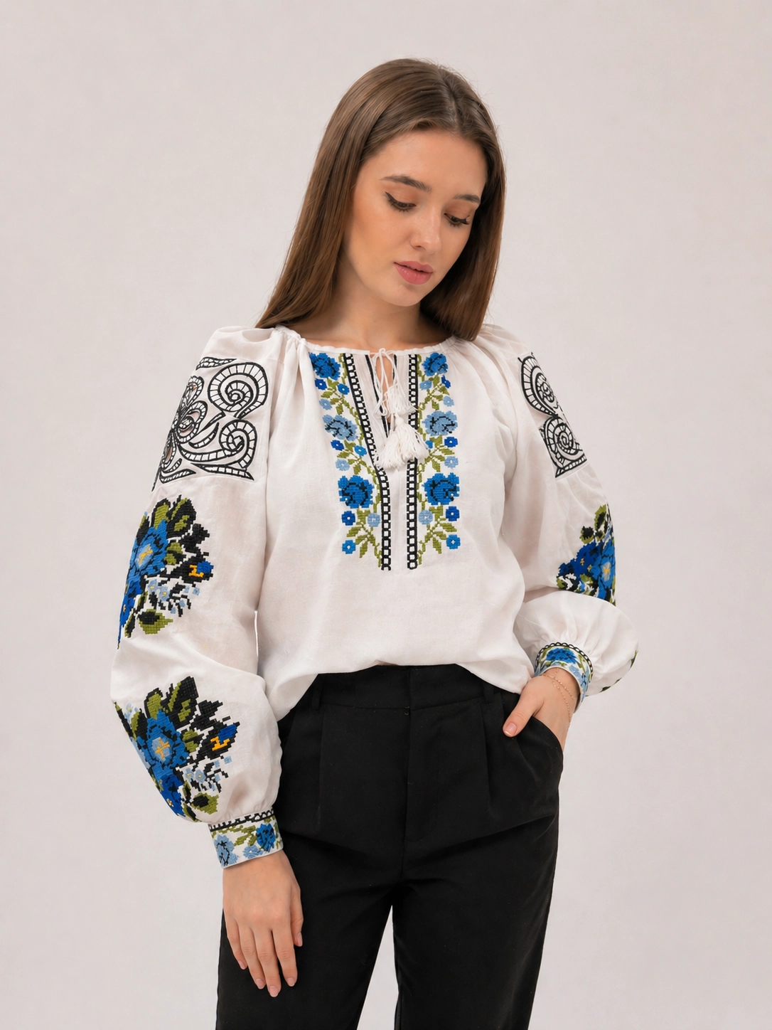 Piękna haftowana koszula damska to idealne połączenie klasycznej elegancji z komfortem noszenia. Jej dopracowany krój zapewnia swobodę ruchów, a niezwykle bogaty haft nadaje jej wyjątkowego charakteru. Bufiaste rękawy dodają subtelnej lekkości, a przy szyi znajduje się ozdobne wiązanie zakończone chwościkiem, które podkreśla folkowy styl bluzki. Haft krzyżykowy. Przy dekolcie wiązana chwościkami . Rękawy zdobione ażurowym wzorem.