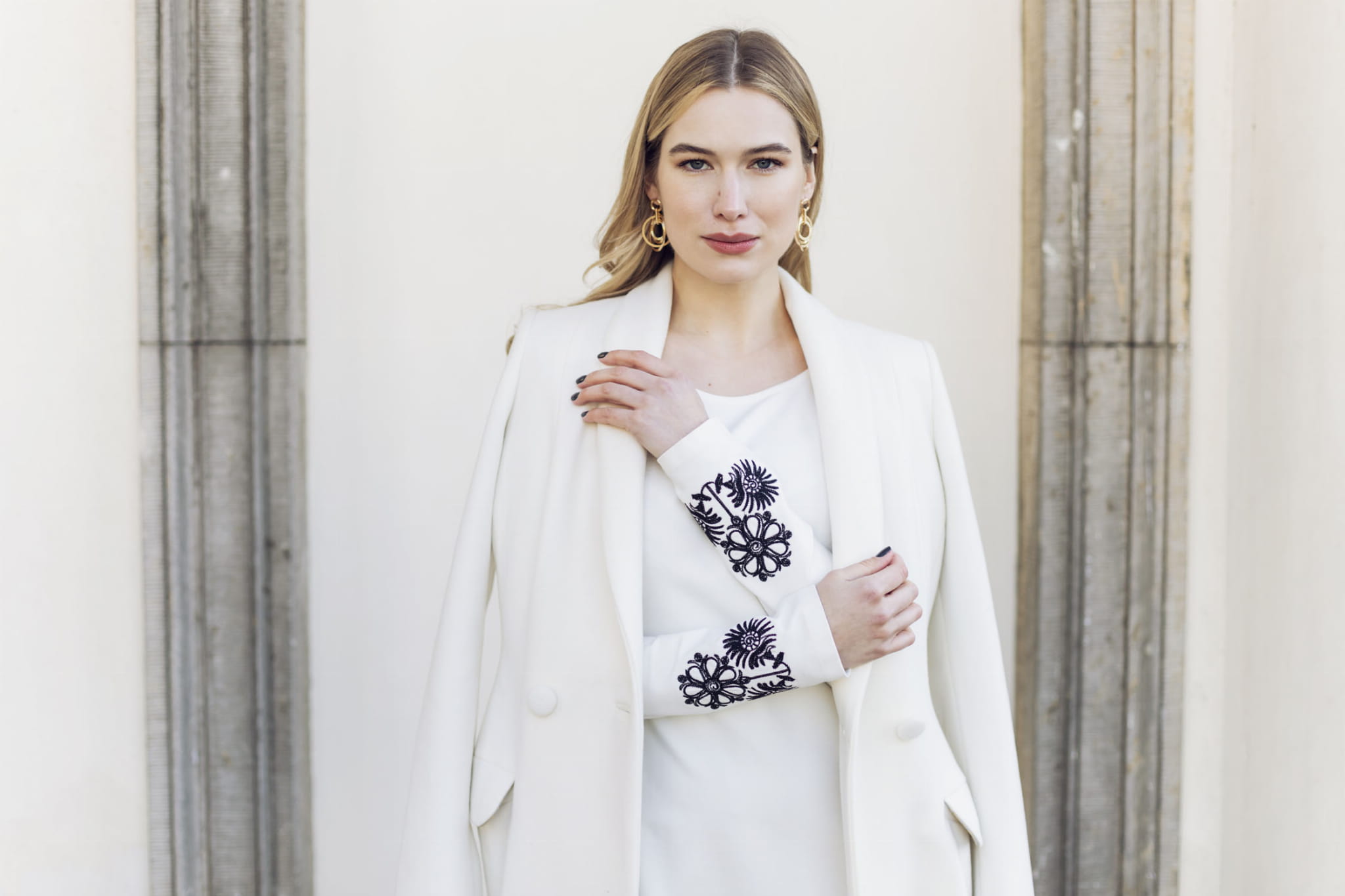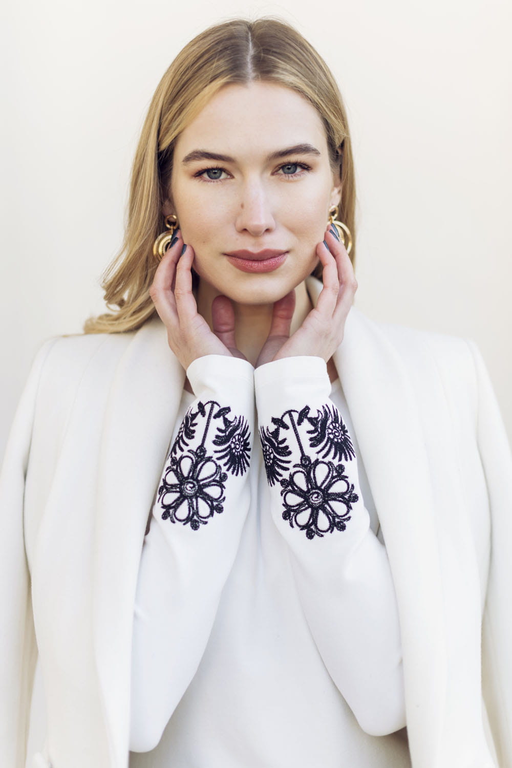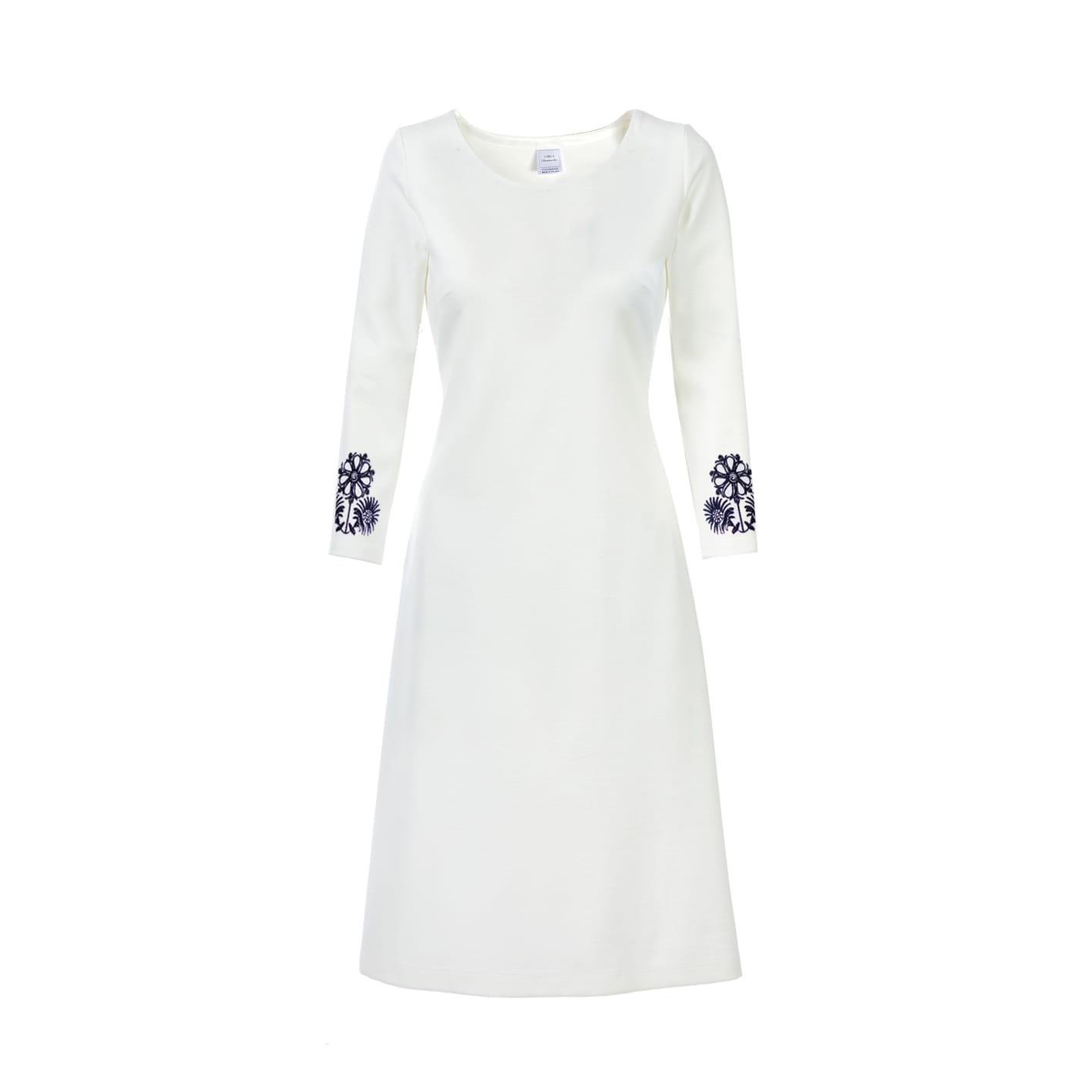 Monochromatyczny, roślinny, niepowtarzalny motyw haftu wilanowskiego jest jednym z ciekawszych wzorów haftów ludowych. W tradycyjnych strojach ludowych Urzecza zdobi górę rękawów kobiecych koszul oraz rogi i brzegi chust. Wygodna i klasyczna sukienka jest idealna dla każdej figury.