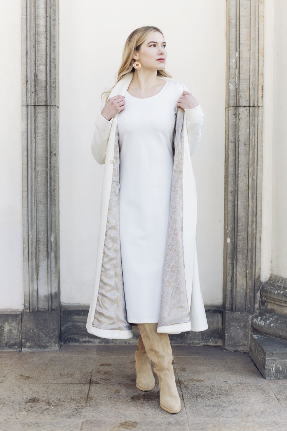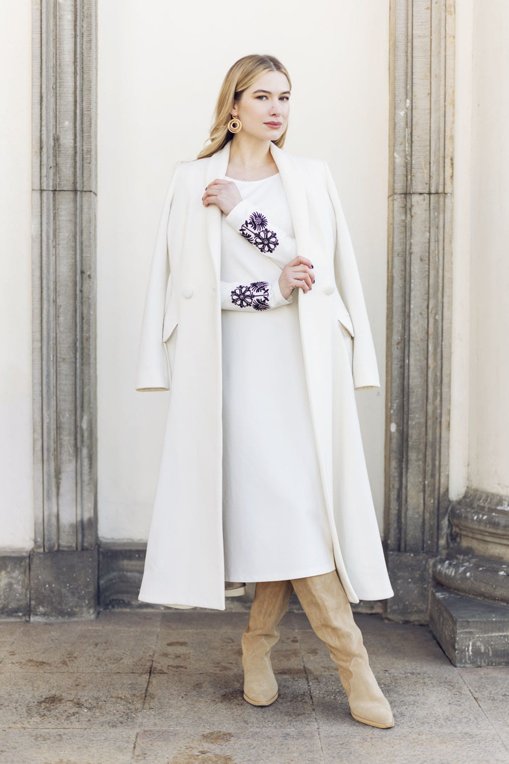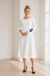 Sukienka ma lekko rozszerzany fason, łagodnie opływa biodra, jest uszyta z wysokogatunkowych materiałów, więc doskonale sprawdza się przez cały rok, ale najbardziej jako zimowa stylizacja, kobiet ceniących klasyczne ubrania z nutą folkową.