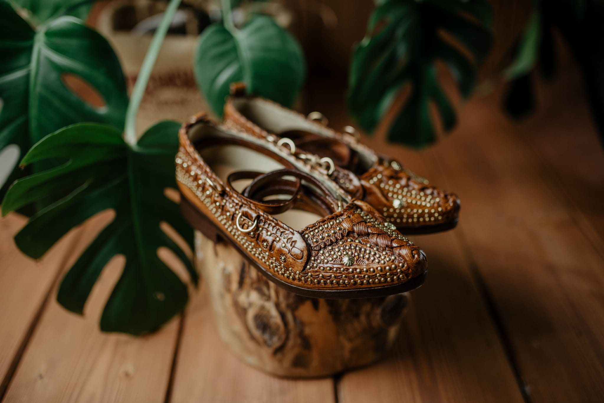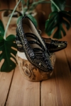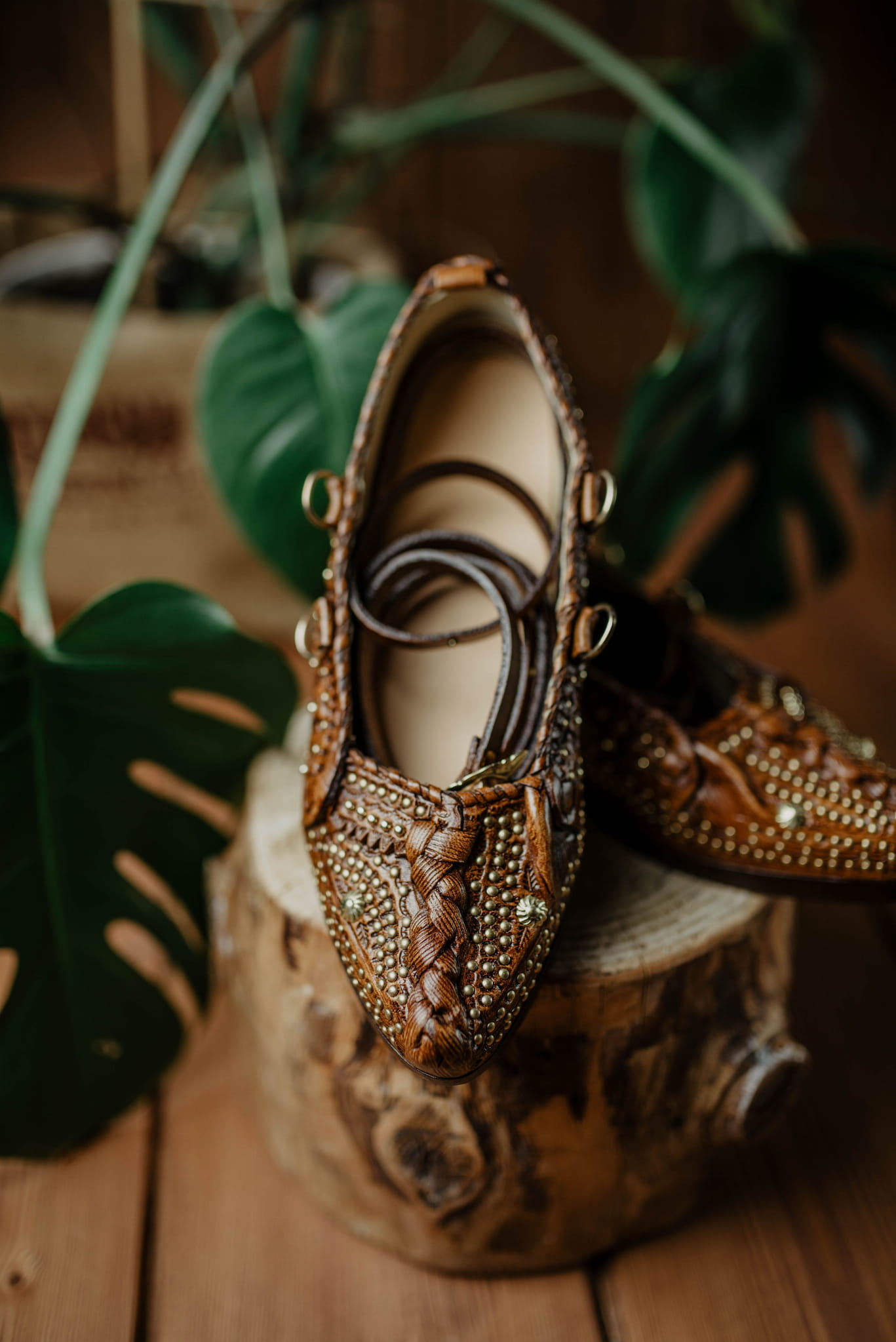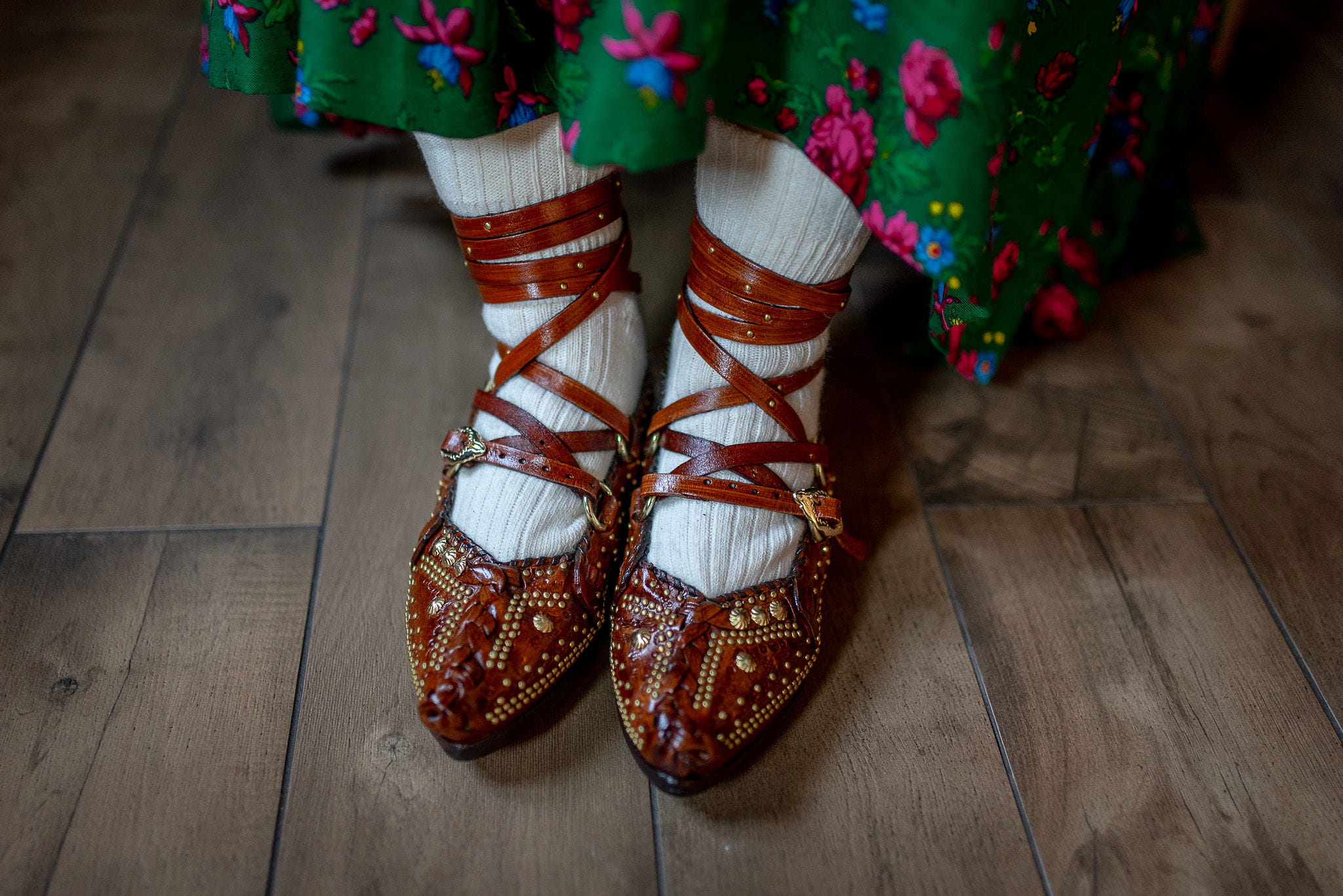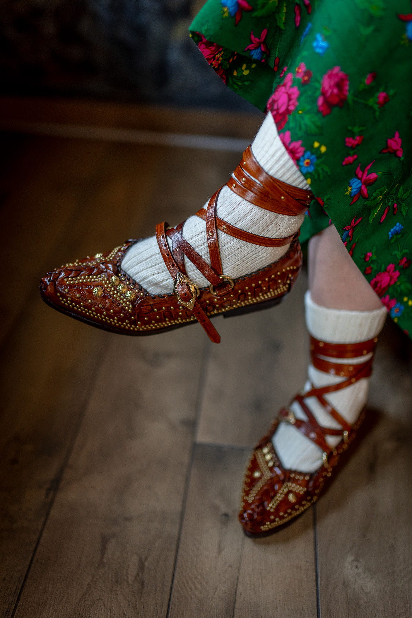Kierpce wykonane z naturalnej skóry, z charakterystycznym zdobieniem i plecionym detalem na przodzie. Długie rzemienie pozwalają na dopasowanie do stopy oraz indywidualny sposób wiązania, co zapewnia wygodę i stabilność noszenia.