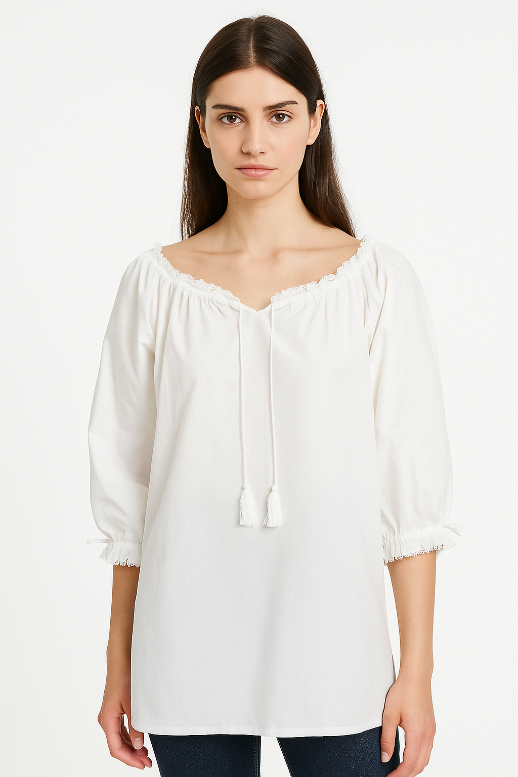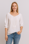 Klasyczna biała bluzka z rękawem 3/4 oraz troczkami zakończonymi metalowym elementem. Dekolt oraz rękawki wykończone delikatną koronką. Idealna do wszelkich stylizacji.