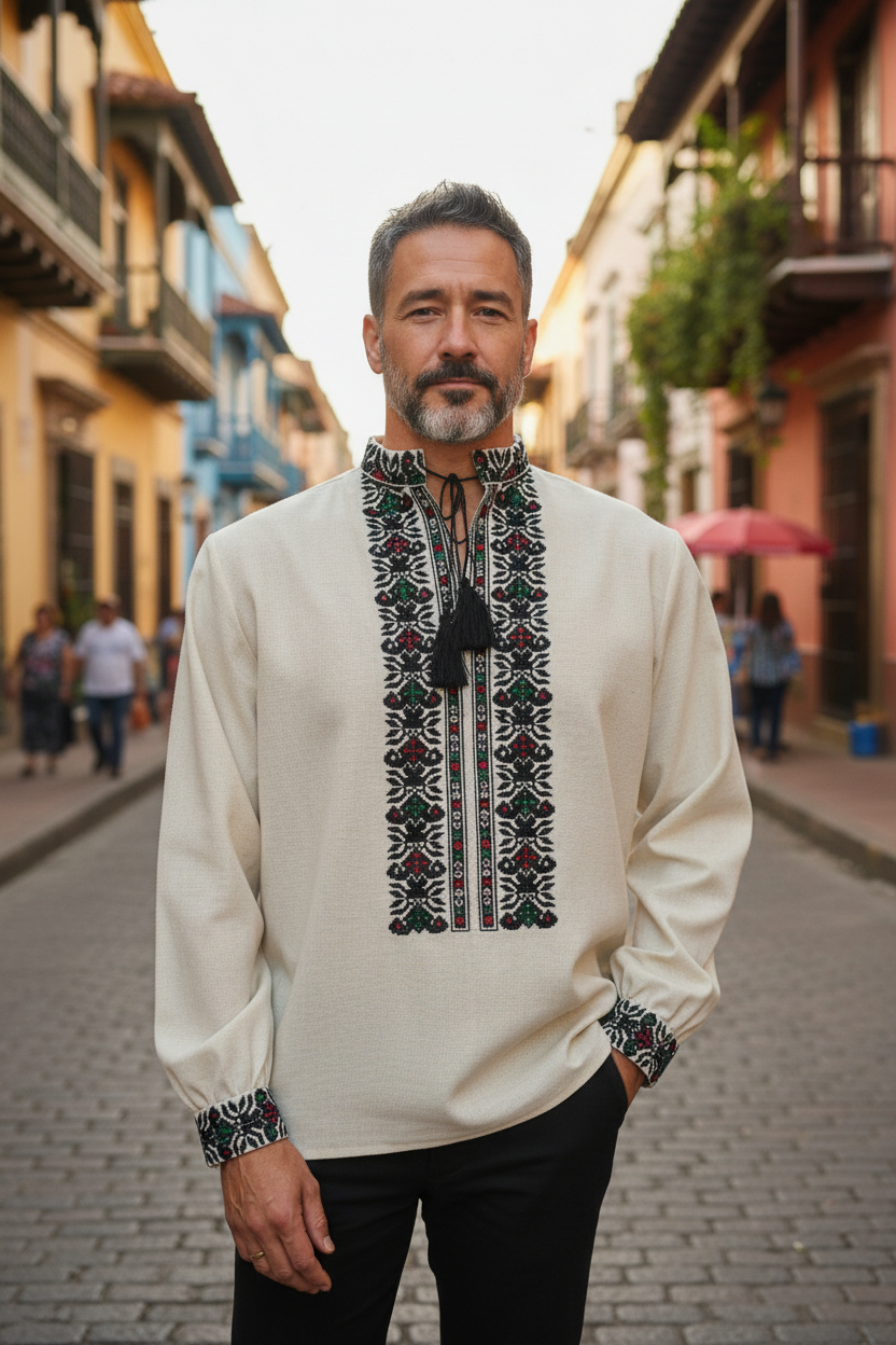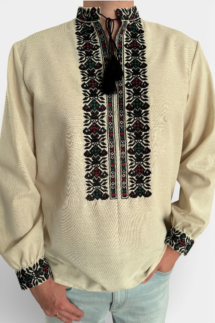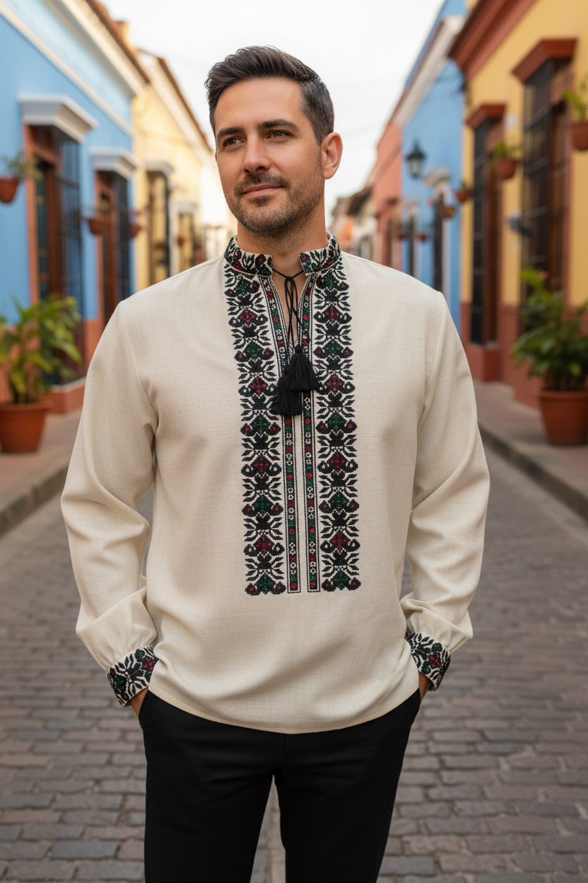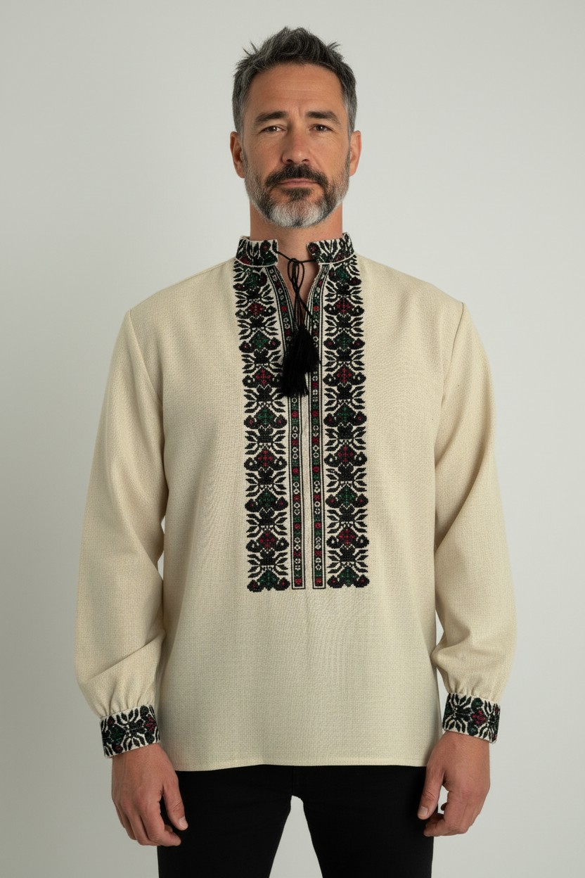Elegancka koszula męska z pięknym, tradycyjnym haftem, inspirowanym wzorami karpackimi i bieszczadzkimi. Bogate, wzory geometryczne dodają koszuli wyjątkowego charakteru, przywołując na myśl starodawne techniki haftu przekazywane z pokolenia na pokolenie.