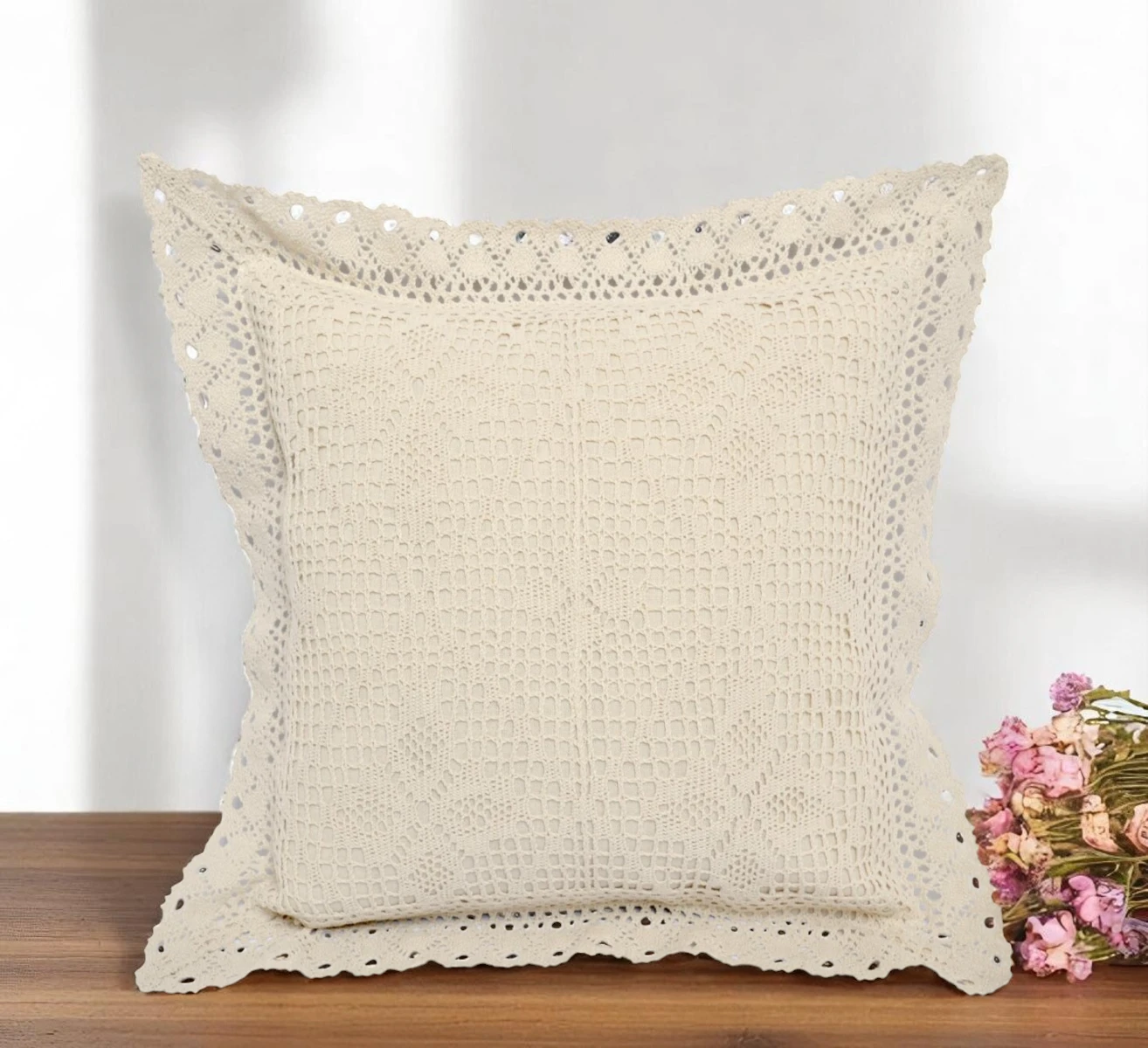 • Wykończenie: ozdobna koronka wokół brzegów oraz na froncie poszewki, nadająca całości lekkości i elegancji