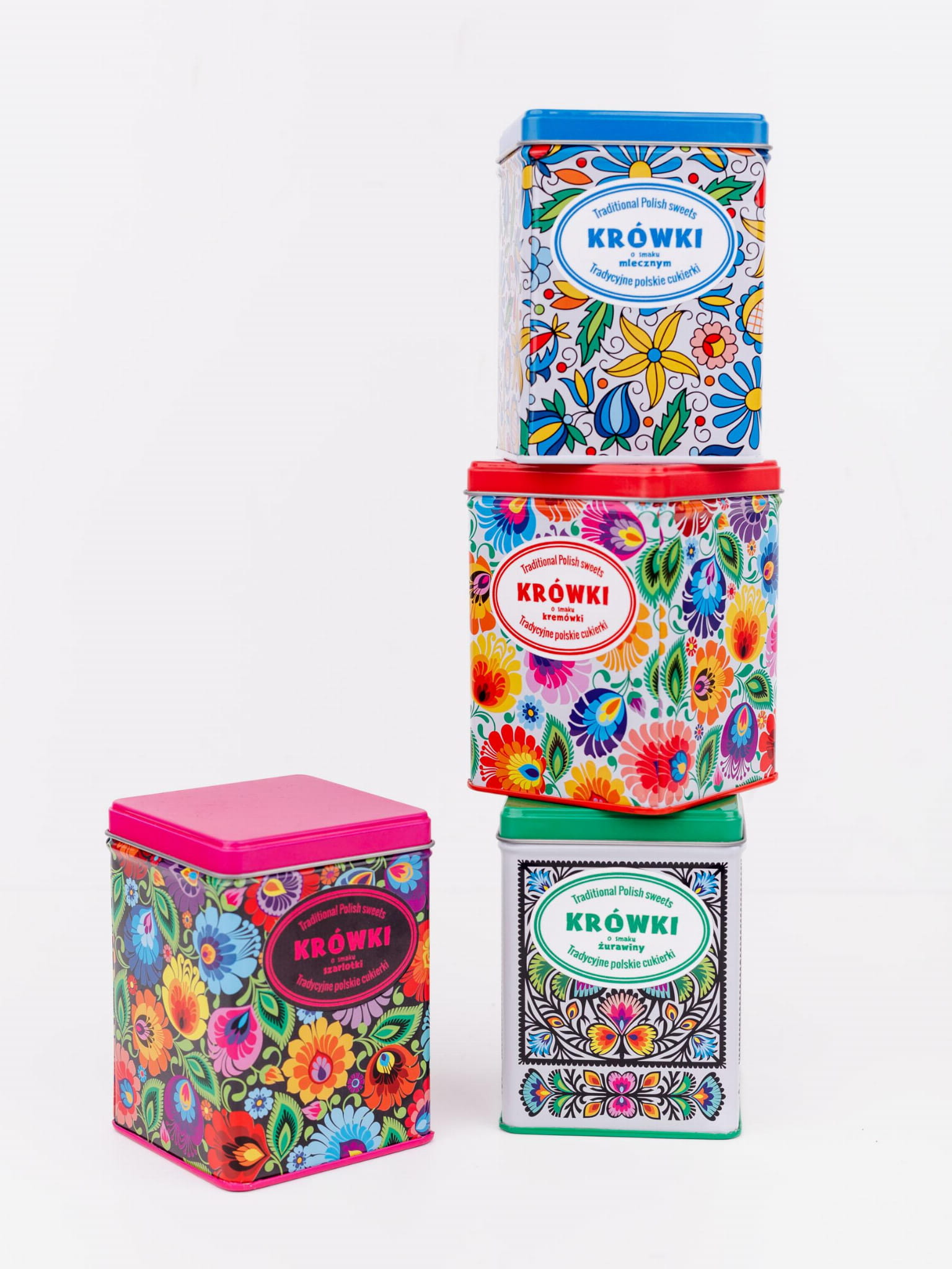 Krówki owinięte w papierek z kolorowymi motywami ludowymi