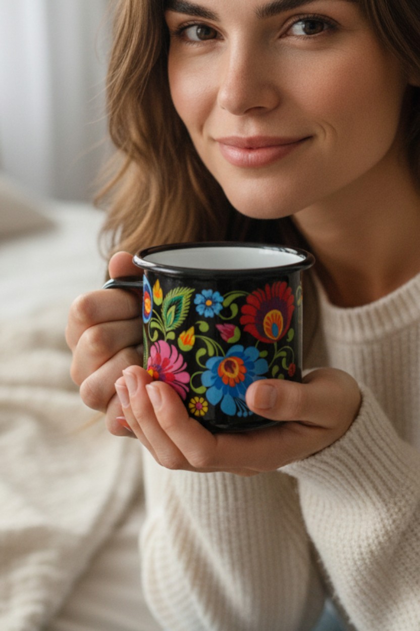 Kubek emaliowany czarny kwiaty łowickie Janek
