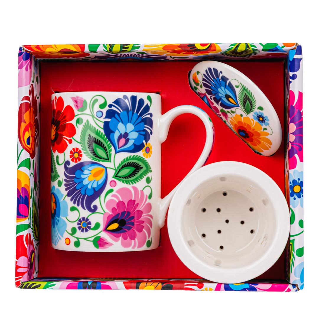 Kubek z zaparzaczem 280 ml - łowicki czarny wykonany z wysokiej jakości porcelany i wyposażony w zaparzacz oraz pokrywkę, kubek utrzymuje napój ciepły przez dłuższy czas, a jednocześnie pozwala cieszyć się jego pełnym smakiem. Idealny na poranne chwile relaksu, przerwy w pracy czy spotkania przy herbacie z przyjaciółmi.