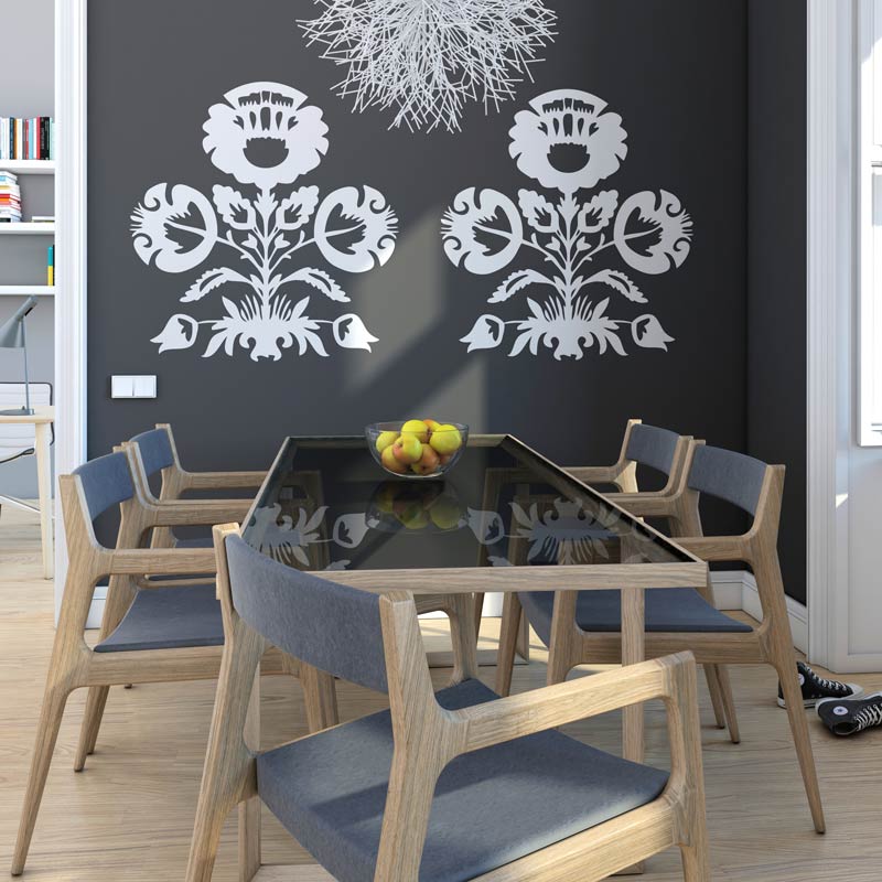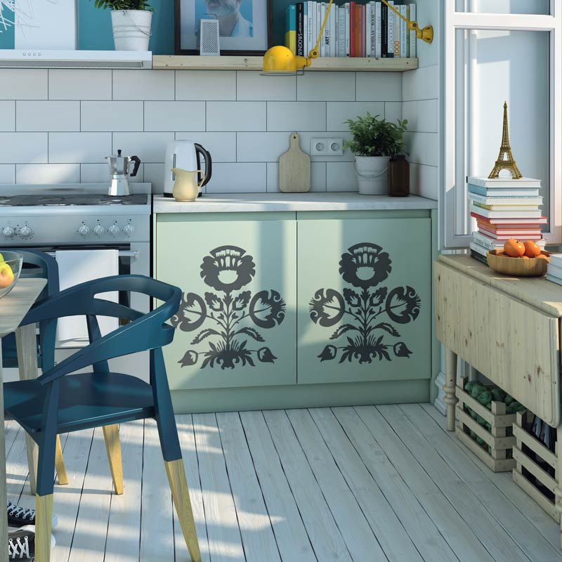 Szablon malarski przeznaczony jest do jednorazowego użytku i wykonany z samoprzylepnej folii transparentnej (przezroczystej). Bardzo dokładnie przylega do ściany, wykonane wzory są idealnie równe, bez najmniejszych zacieków.