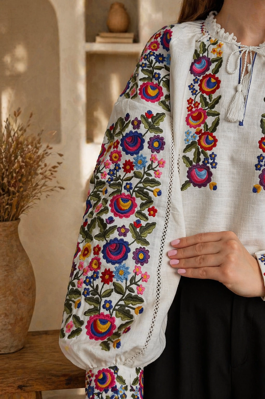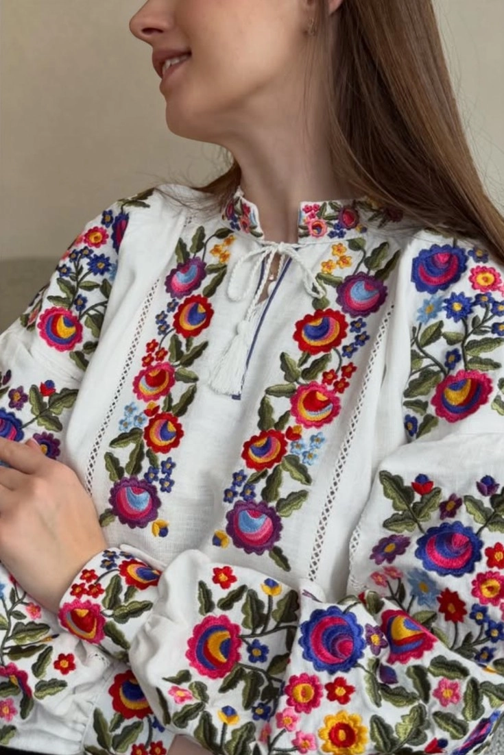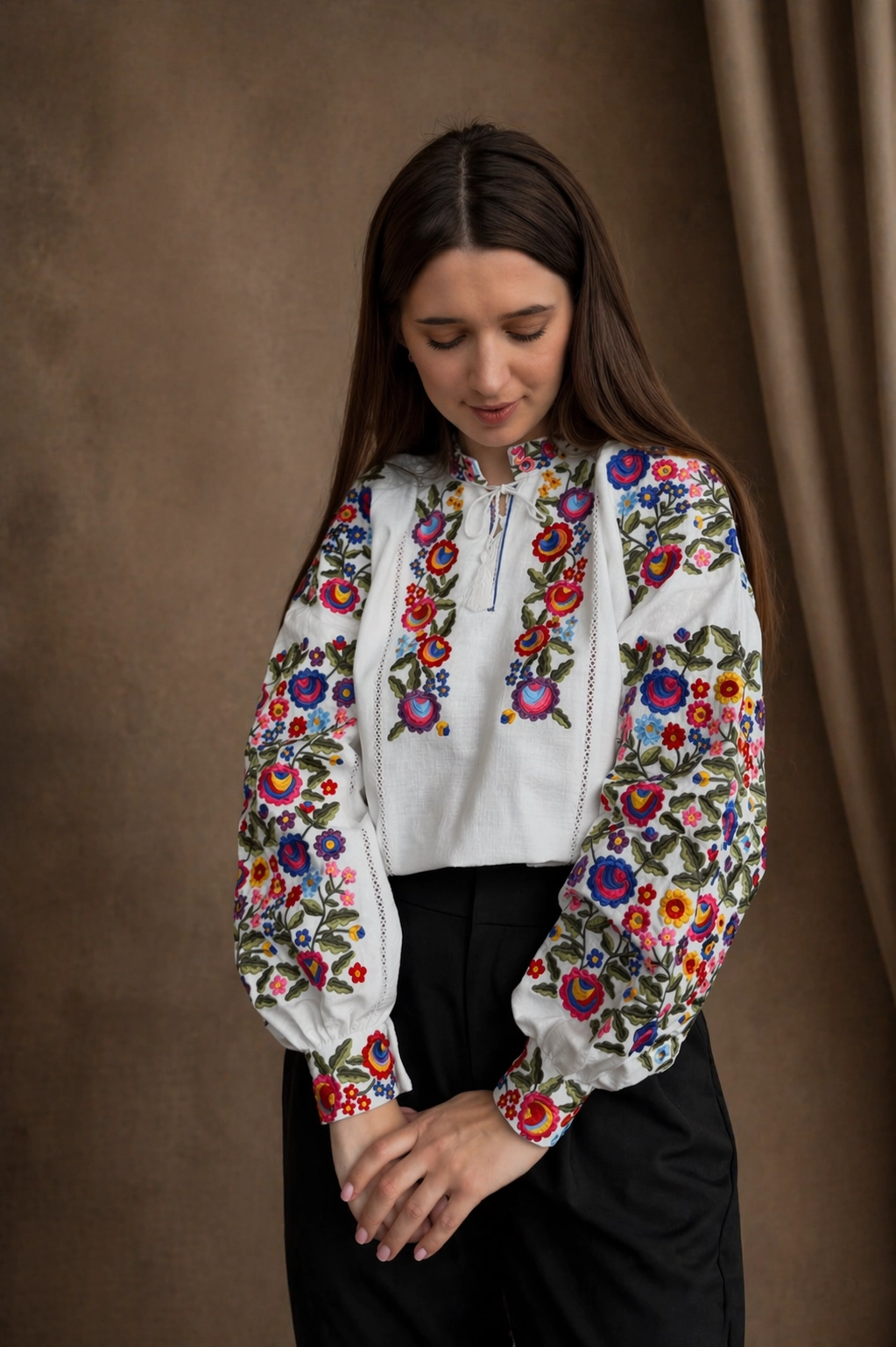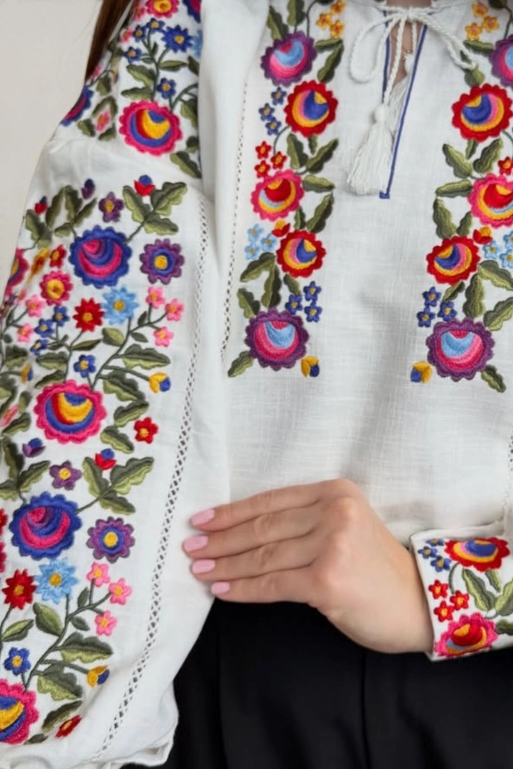 Piękna haftowana koszula damska to idealne połączenie klasycznej elegancji z komfortem noszenia. Jej dopracowany krój zapewnia swobodę ruchów, a niezwykle bogaty haft nadaje jej wyjątkowego charakteru. Bufiaste rękawy dodają subtelnej lekkości, a przy szyi znajduje się ozdobne wiązanie zakończone chwościkiem, które podkreśla folkowy styl bluzki.