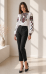 Piękna haftowana koszula damska to idealne połączenie klasycznej elegancji z komfortem noszenia. Jej dopracowany krój zapewnia swobodę ruchów, a niezwykle bogaty haft nadaje jej wyjątkowego charakteru. Bufiaste rękawy dodają subtelnej lekkości, a przy szyi znajduje się ozdobne wiązanie zakończone chwościkiem, które podkreśla folkowy styl bluzki.