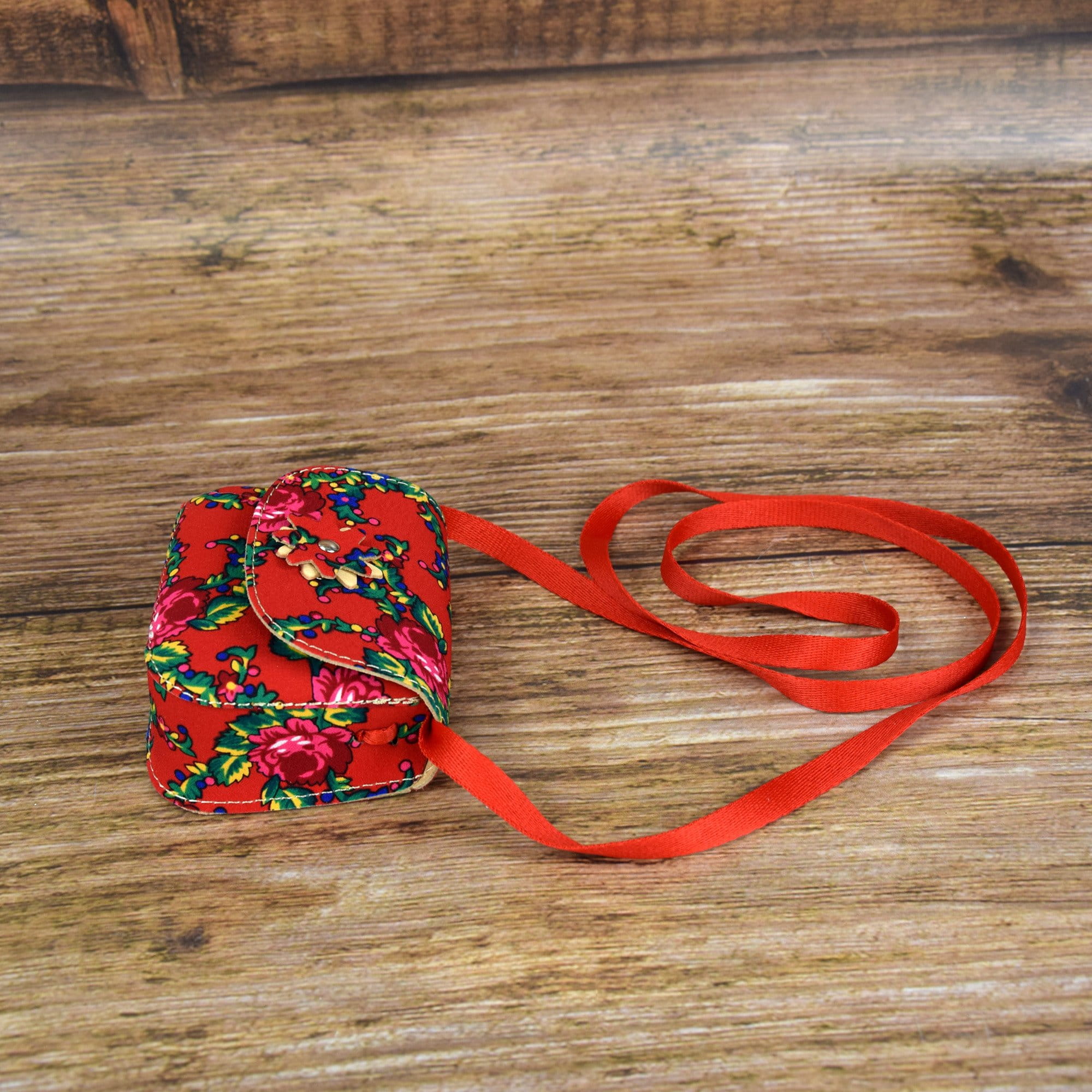 Torebka góralska obszyta materiałem folkowym. Zamykanie na zatrzask. Możliwość regulacji długości paska. Idealny dodatek do ubrań typu Folk. Idealna dla dziewczynek