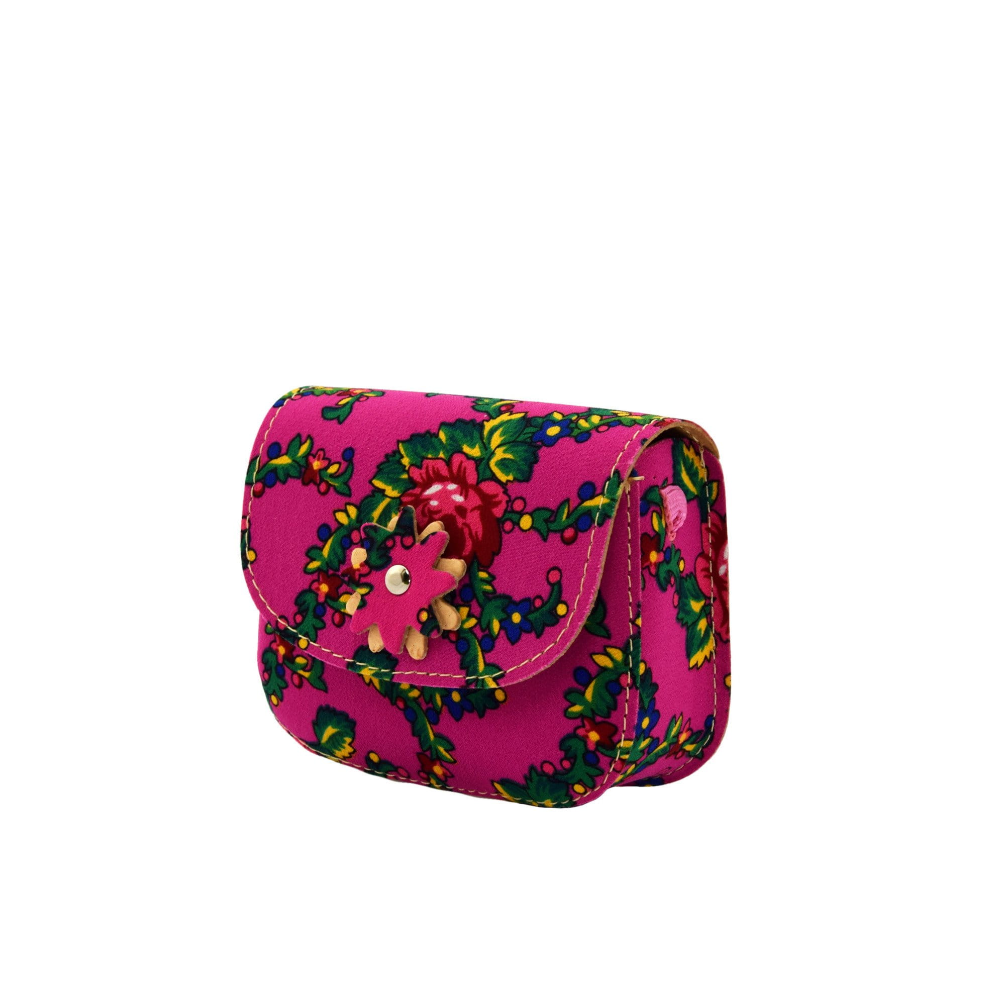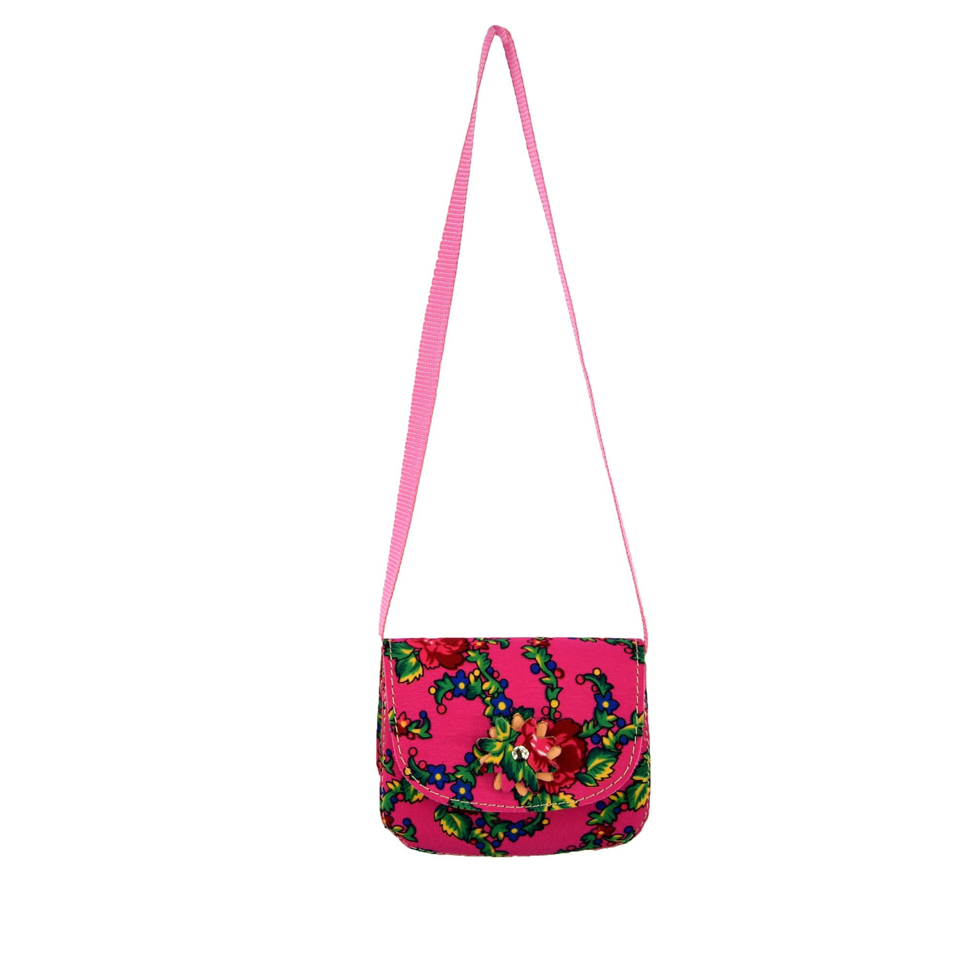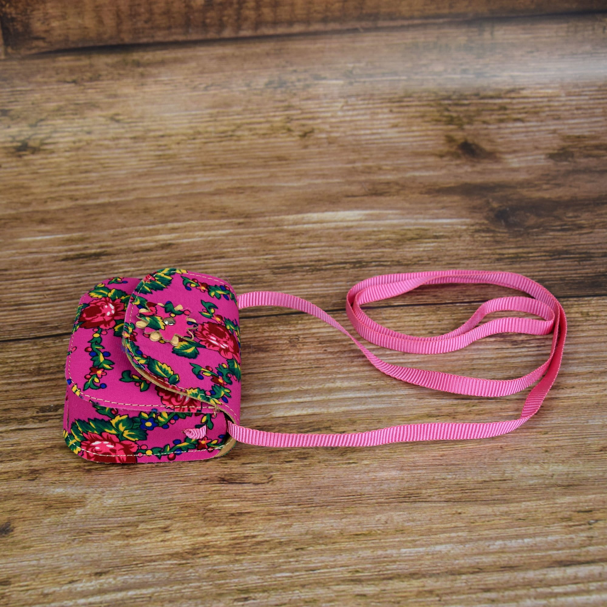 Torebka góralska obszyta materiałem folkowym. Zamykanie na zatrzask. Możliwość regulacji długości paska. Idealny dodatek do ubrań typu Folk. Idealna dla dziewczynek