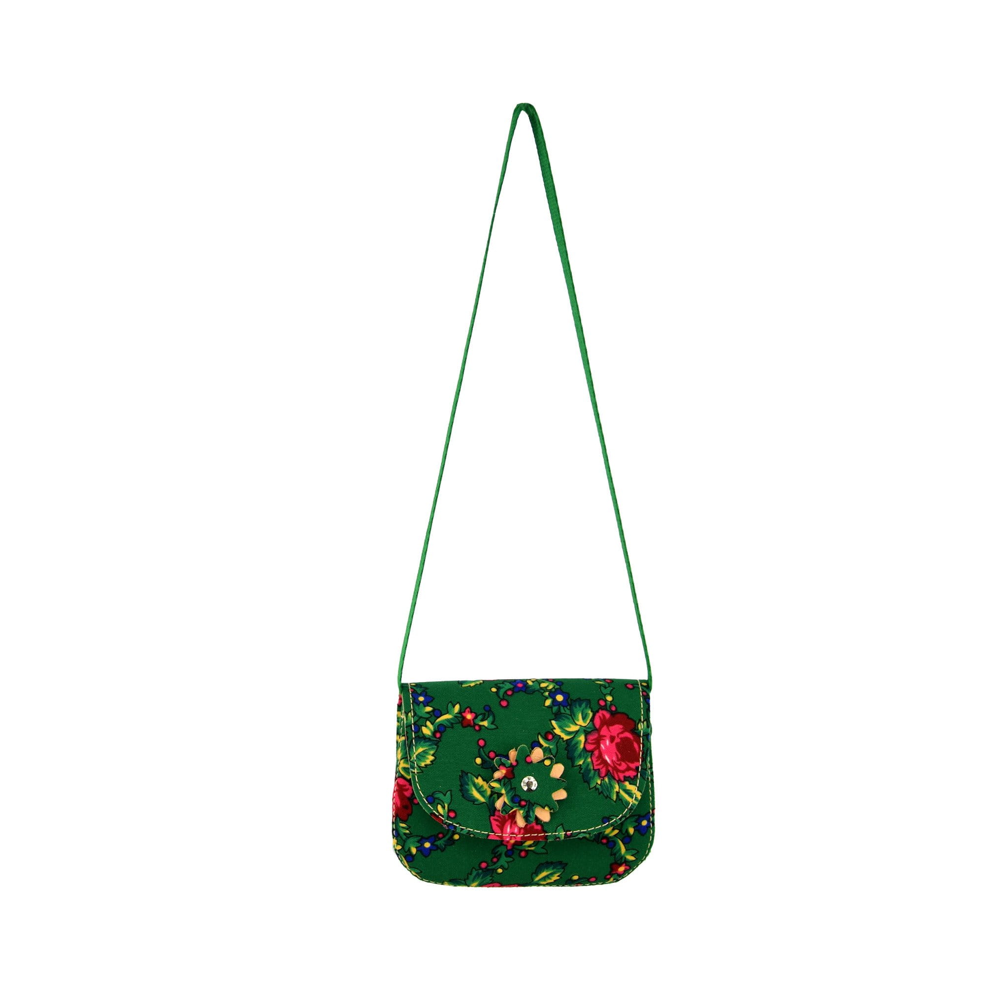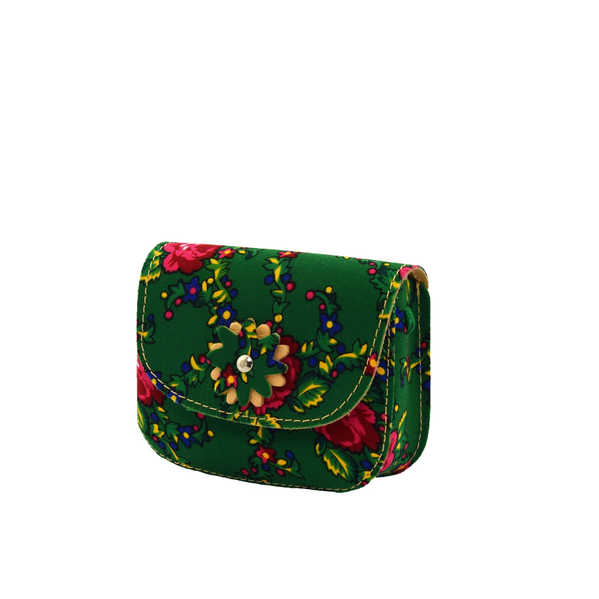 Torebka góralska obszyta materiałem folkowym. Zamykanie na zatrzask. Możliwość regulacji długości paska. Idealny dodatek do ubrań typu Folk. Idealna dla dziewczynek