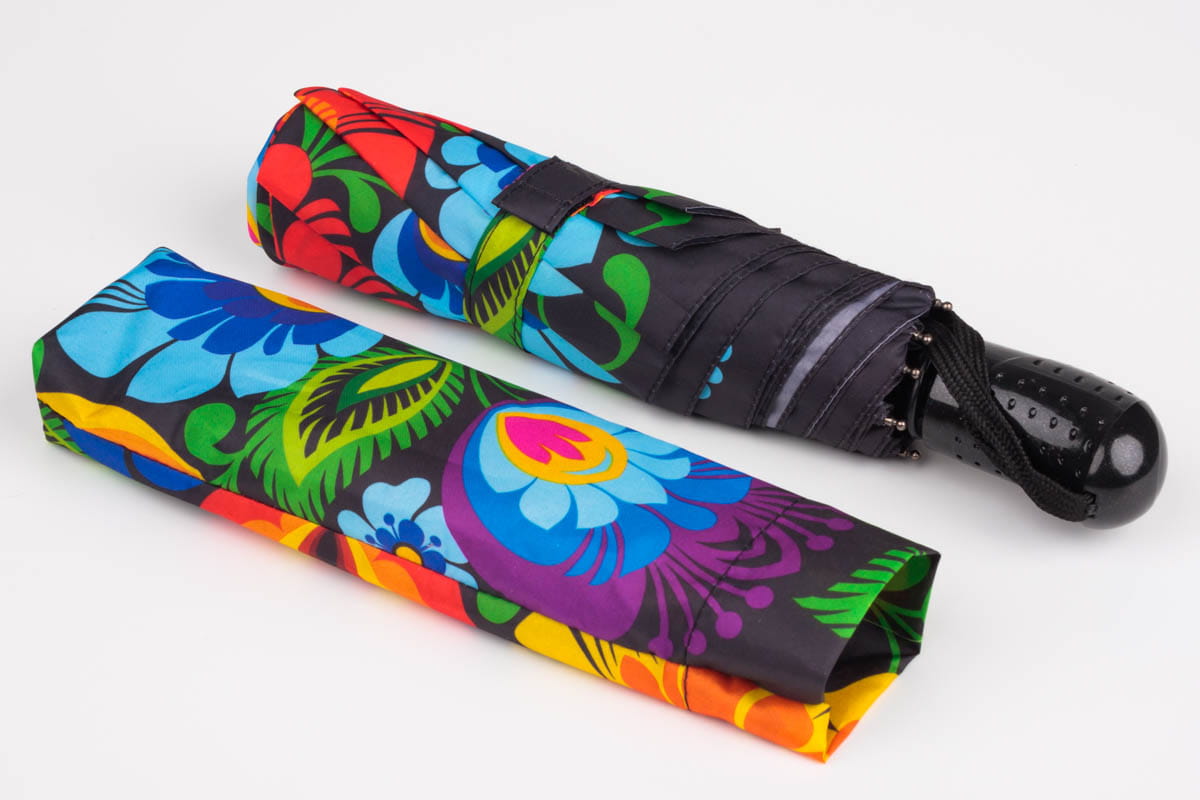 Mała folk parasolka z łowickim wzorem ludowym. Parasolka w łowickie wzory rozpromieni nawet najbardziej ponury dzień. Gwarantujemy uśmiech przechodniów. Dodatkową zaletą parasolki są jej niewielkie rozmiary, powinna zmieścić się w każdej damskiej torebce. Łowicką parasolkę zdobią barwne kwiaty z łowickiej wycinanki na czarnym tle. Wzór ten inspirowany jest tradycyjnym wzorem ludowym z regionu łowickiego. Elementem przewodnim na łowickich wycinankach są koguty, pawie oraz motywy kwiatowe.