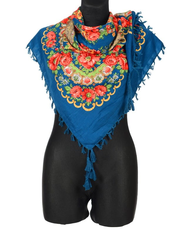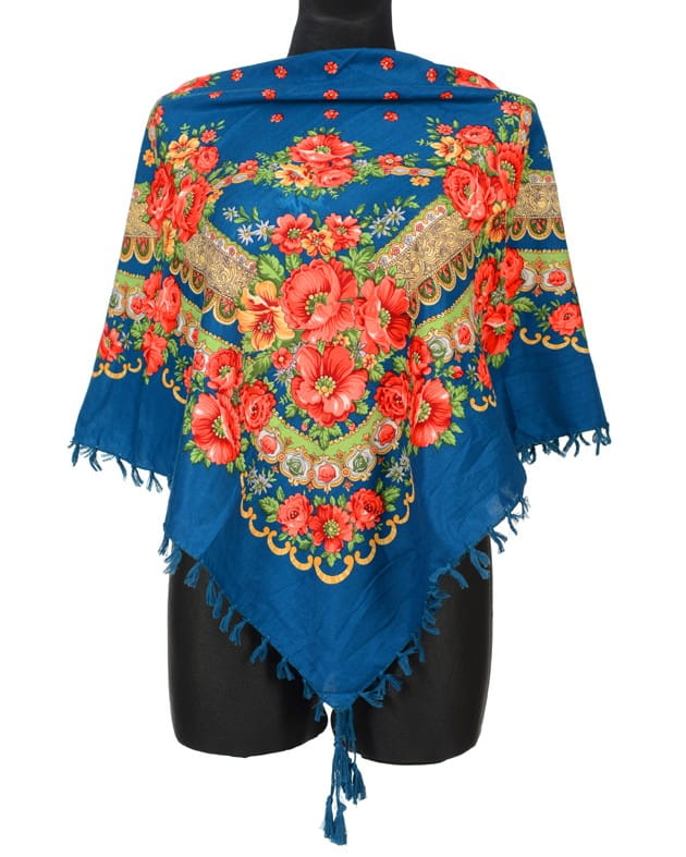Folkowa chusta zdobiona pięknymi kolorowymi kwiatami. Chusta zdobiona krótkimi frędzelkami i została wykonana z bardzo przyjemnej tkaniny. Idealna na każdą porę roku.