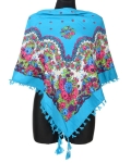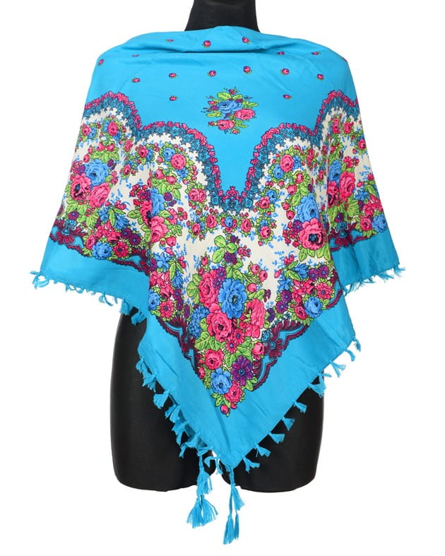 Folkowa chusta zdobiona pięknymi kolorowymi kwiatami. Chusta zdobiona krótkimi frędzelkami i została wykonana z bardzo przyjemnej tkaniny. Idealna na każdą porę roku.