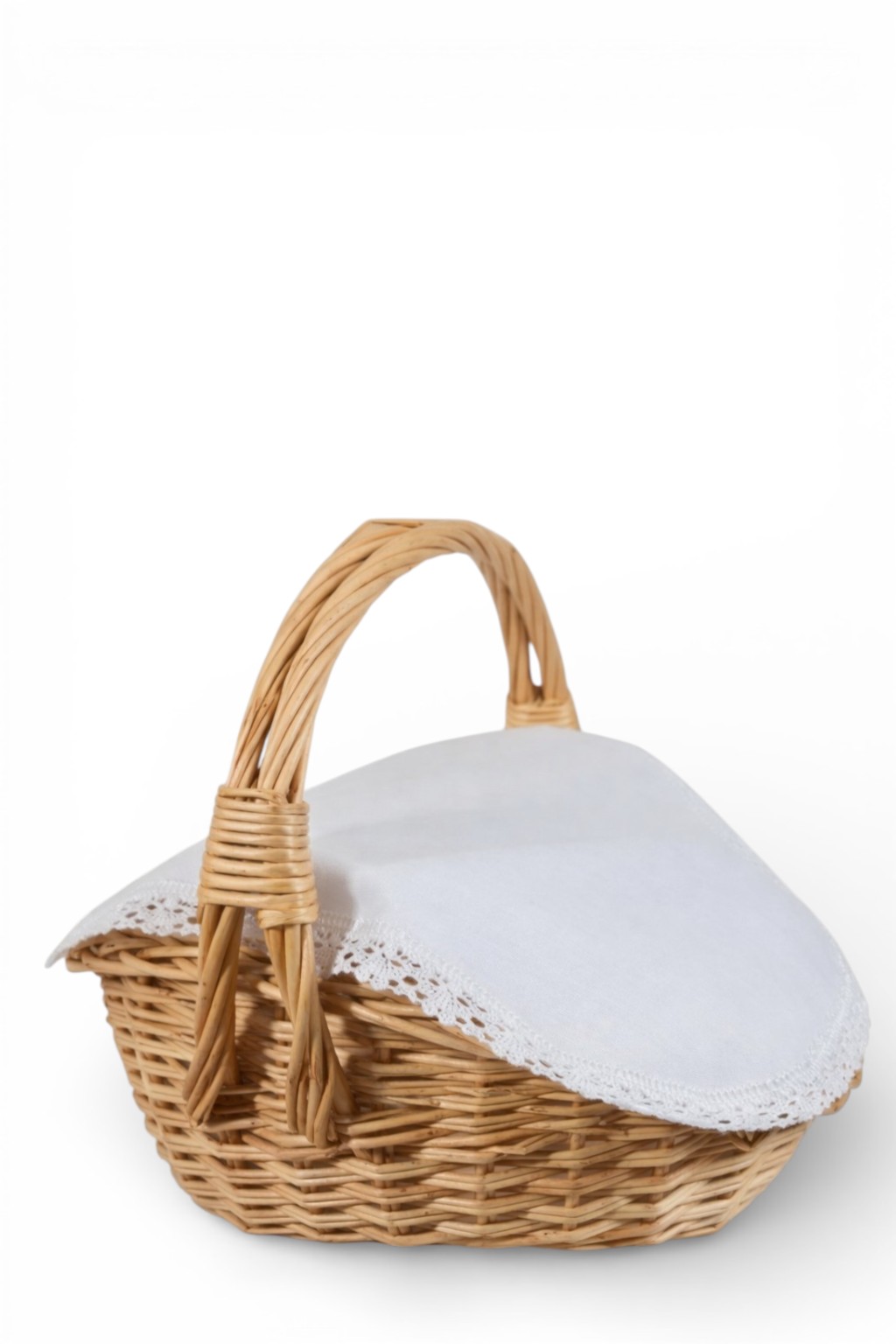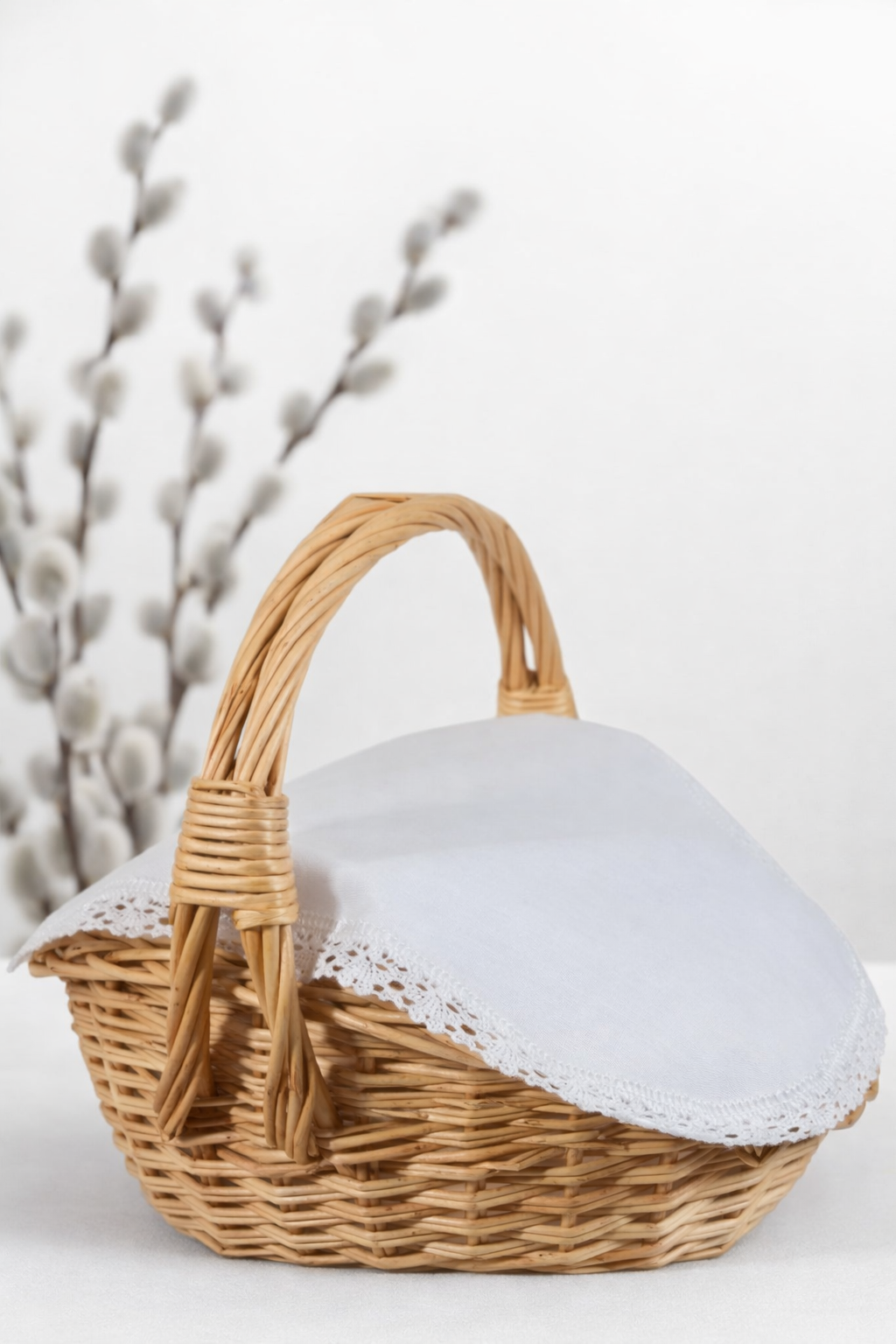 Owalna serwetka przykrycie do koszyczka wielkanocnego z koronką. Idealna dla osób ceniących tradycję i subtelne zdobienia. Wykonana z wysokiej jakości bawełny, ozdobiona delikatną bawełnianą koronką, która dodaje jej wyjątkowego uroku.