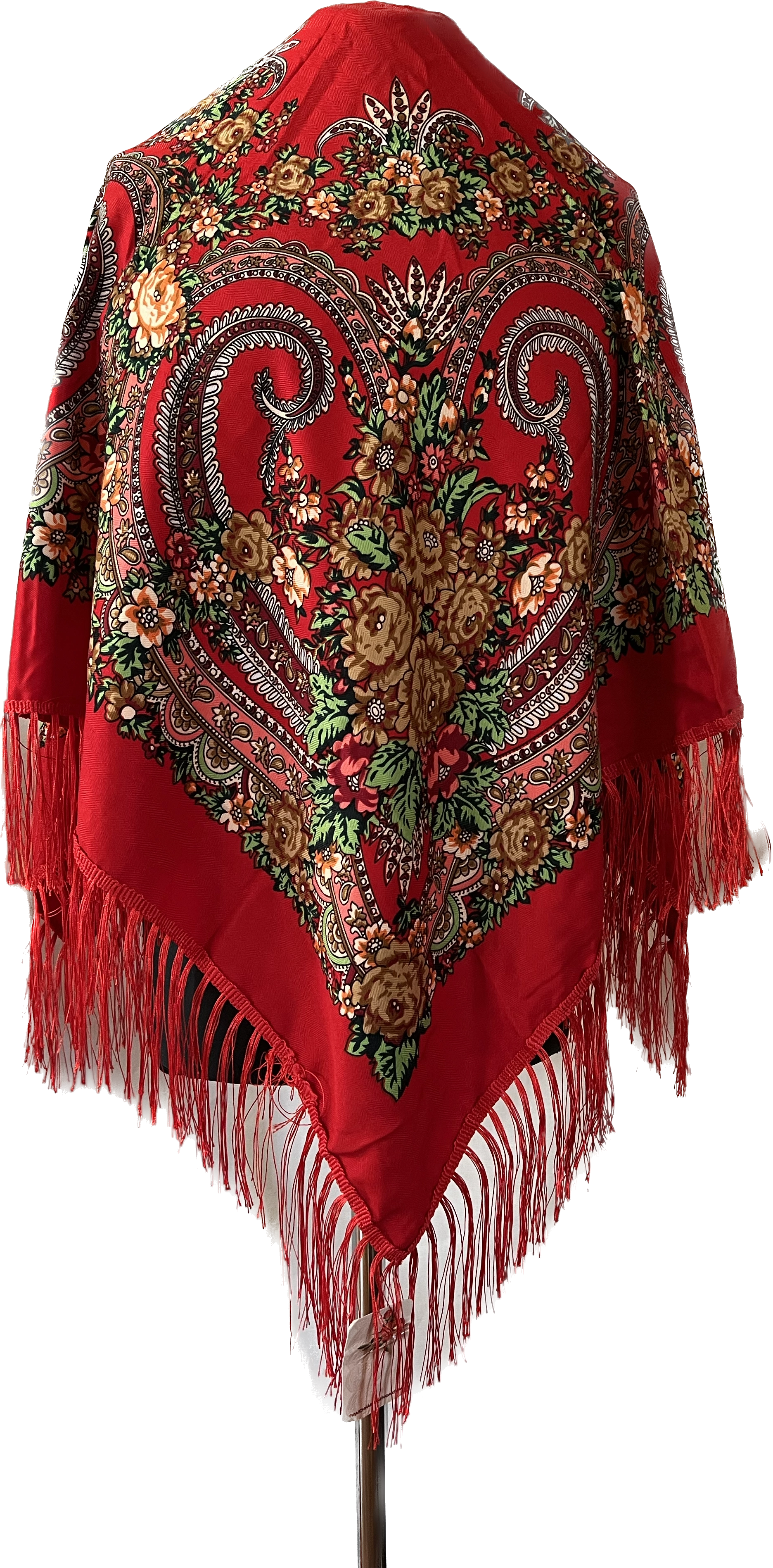 Folkowa chusta zdobiona kolorowymi kwiatami, nawiązująca do tradycji słowiańskiej. Zdobiona błyszczącymi frędzelkami. Chusta bardzo delikatna w dotyku.