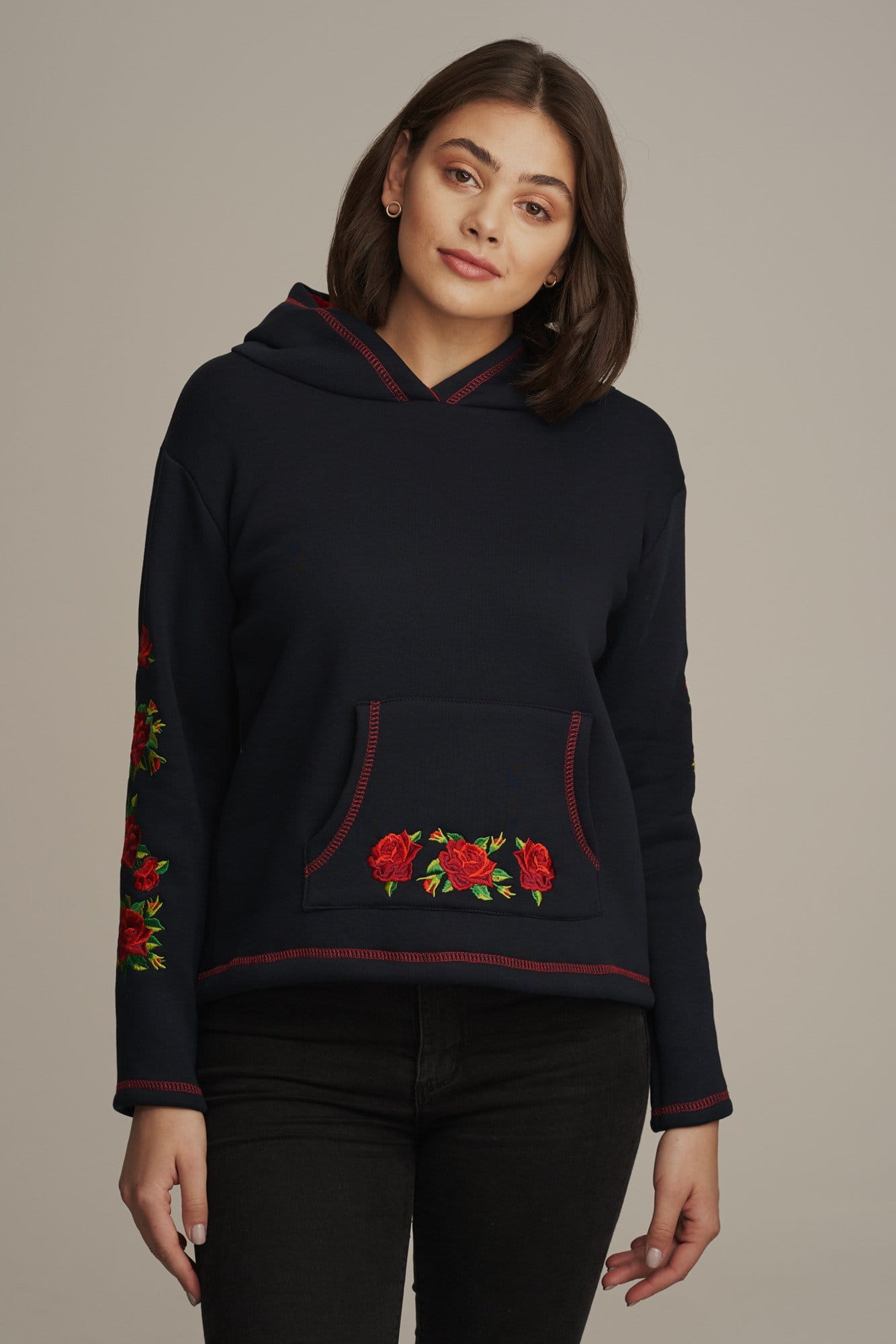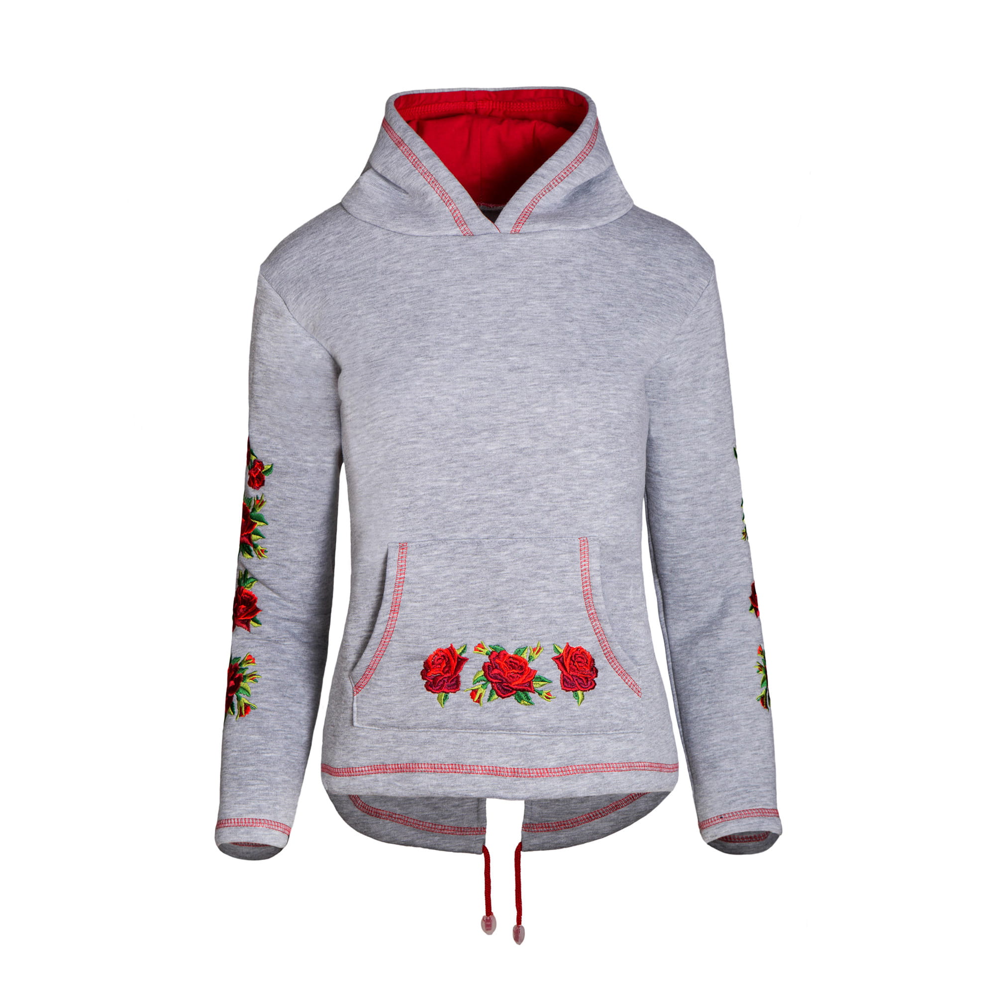 Szara bawełniana bluza z bogatym haftem w róże. Bluza posiada kieszonkę na przodzie oraz kaptur. Bardzo wygodny fason z przedłużanym tyłem. Pasuje do wielu stylizacji. Dostępna jest także w wersji dla dzieci. Można stworzyć idealny zestaw dla mamy i córki.