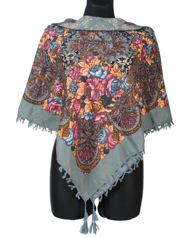 Folkowa chusta zdobiona pięknymi kolorowymi kwiatami. Chusta zdobiona krótkimi frędzelkami i została wykonana z bardzo przyjemnej tkaniny. Idealna na każdą porę roku.