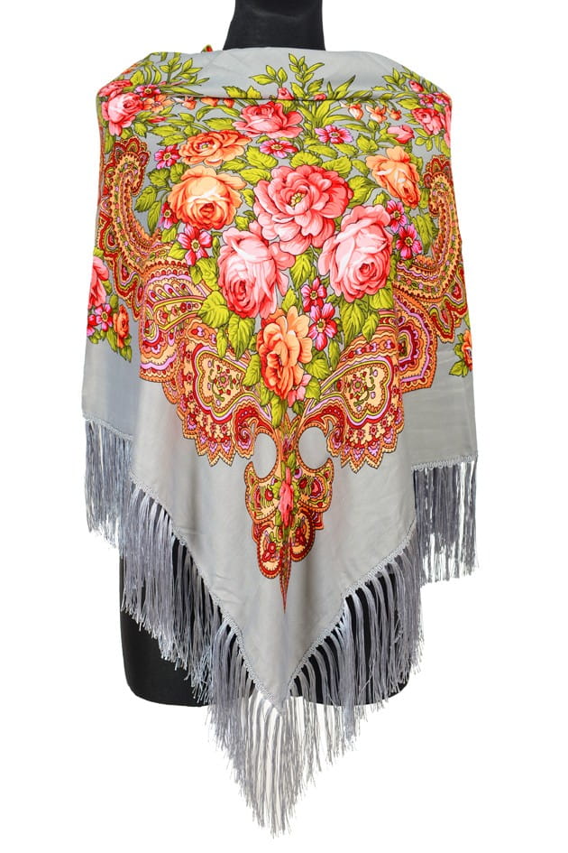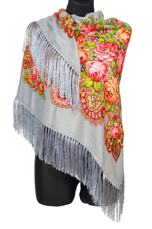Folkowa chusta zdobiona kolorowymi kwiatami, nawiązująca do tradycji słowiańskiej. Zdobiona błyszczącymi frędzelkami. Chusta bardzo delikatna w dotyku.