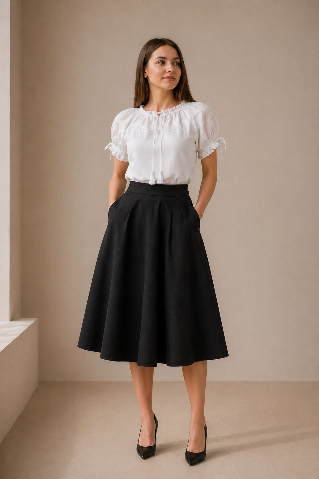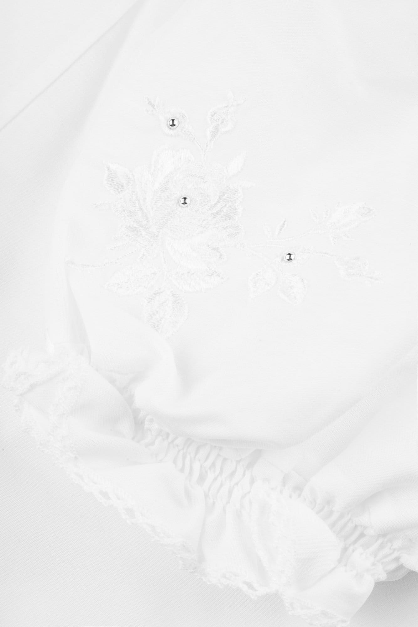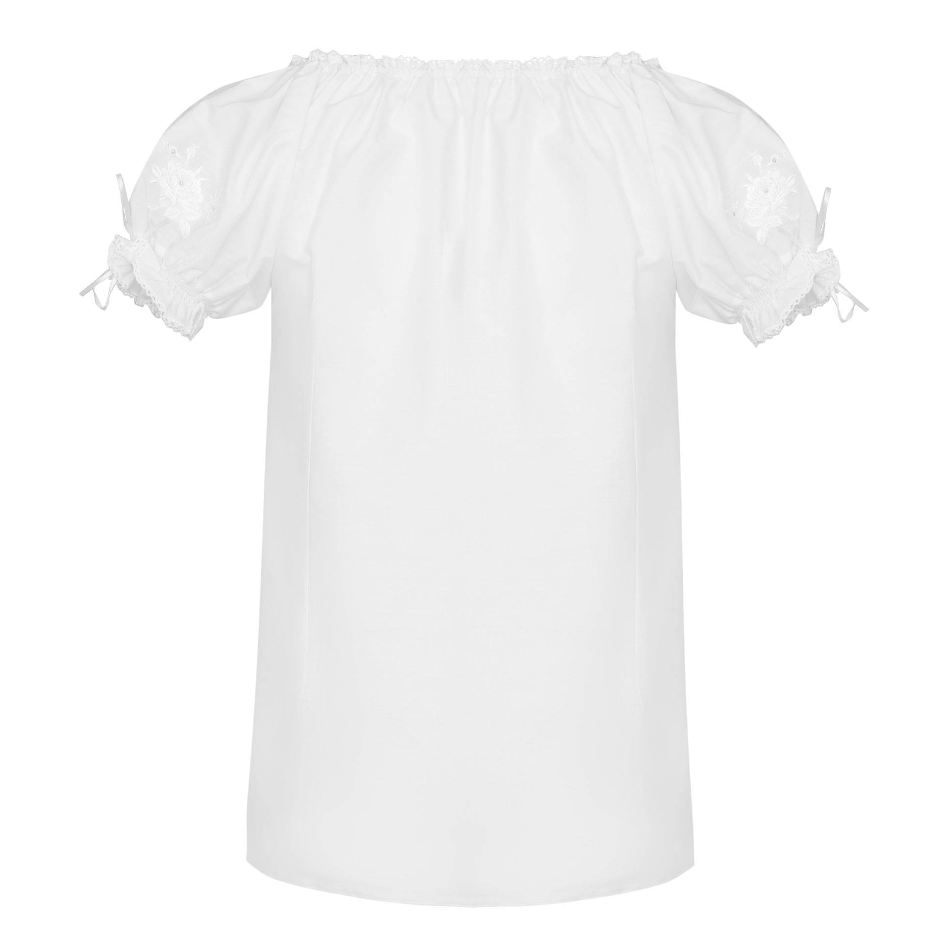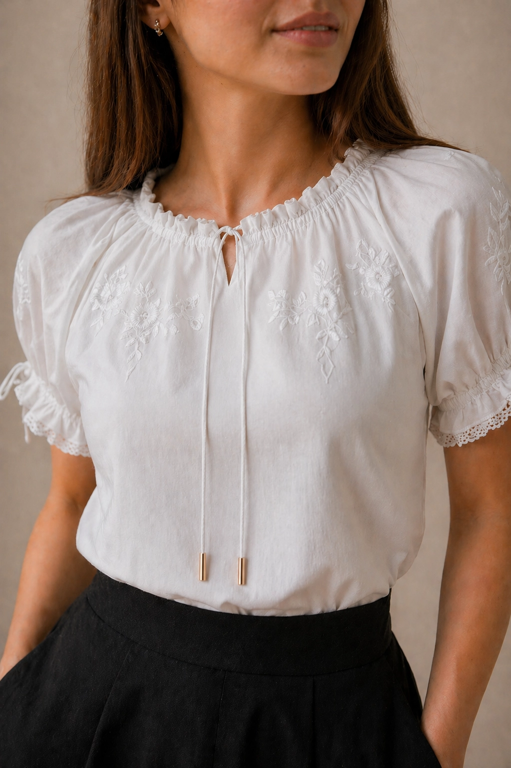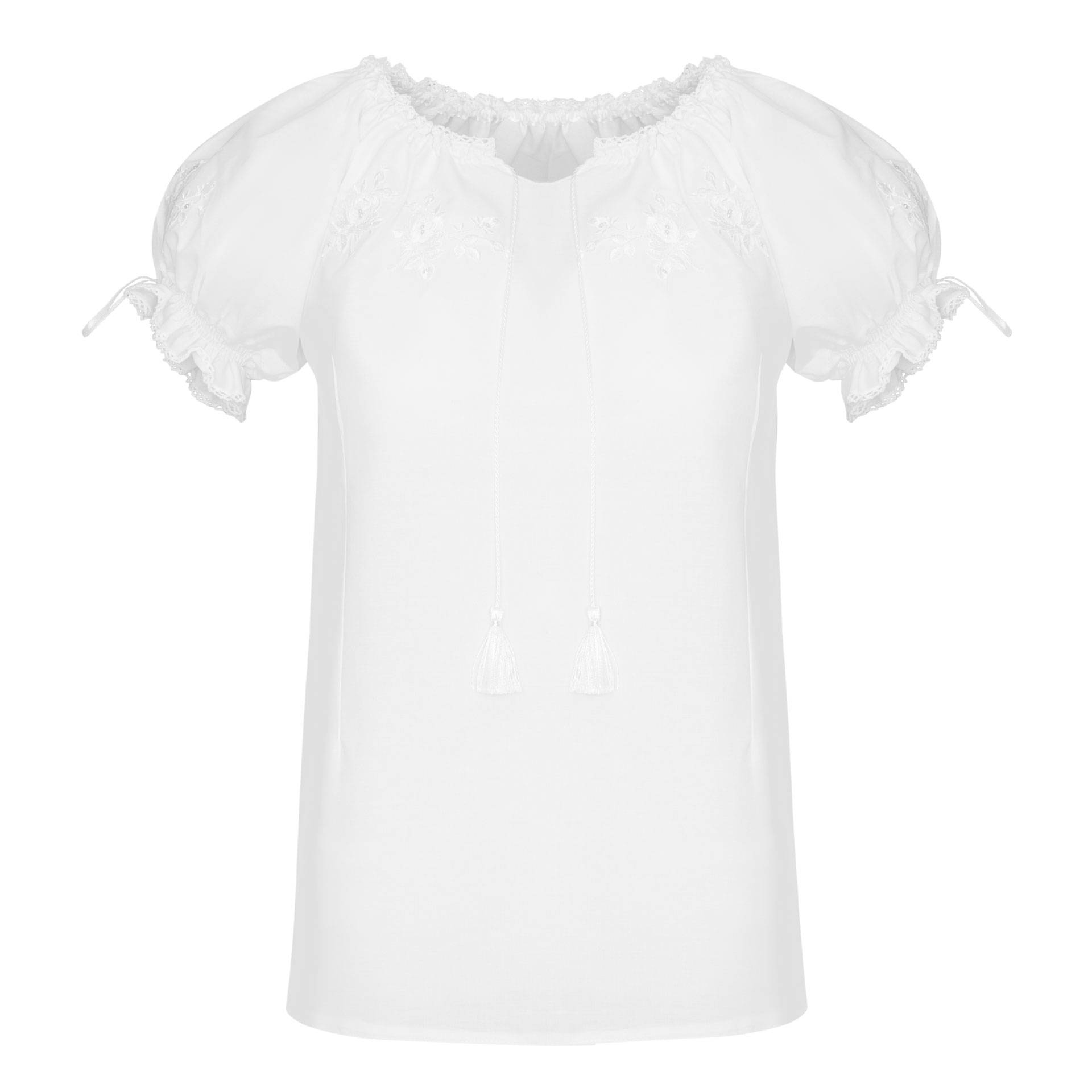 Tradycyjna biała bluzka z haftem. Bogate zdobienie na dekolcie oraz rękawach. Przy dekolcie troczki. Kwiatowe elementy wyszywane nitką nadają bluzce jeszcze większej elegancji.Idealny wybór do kreacji typu FOLK.