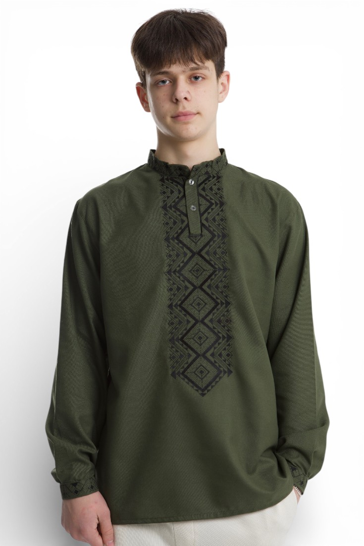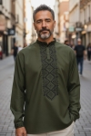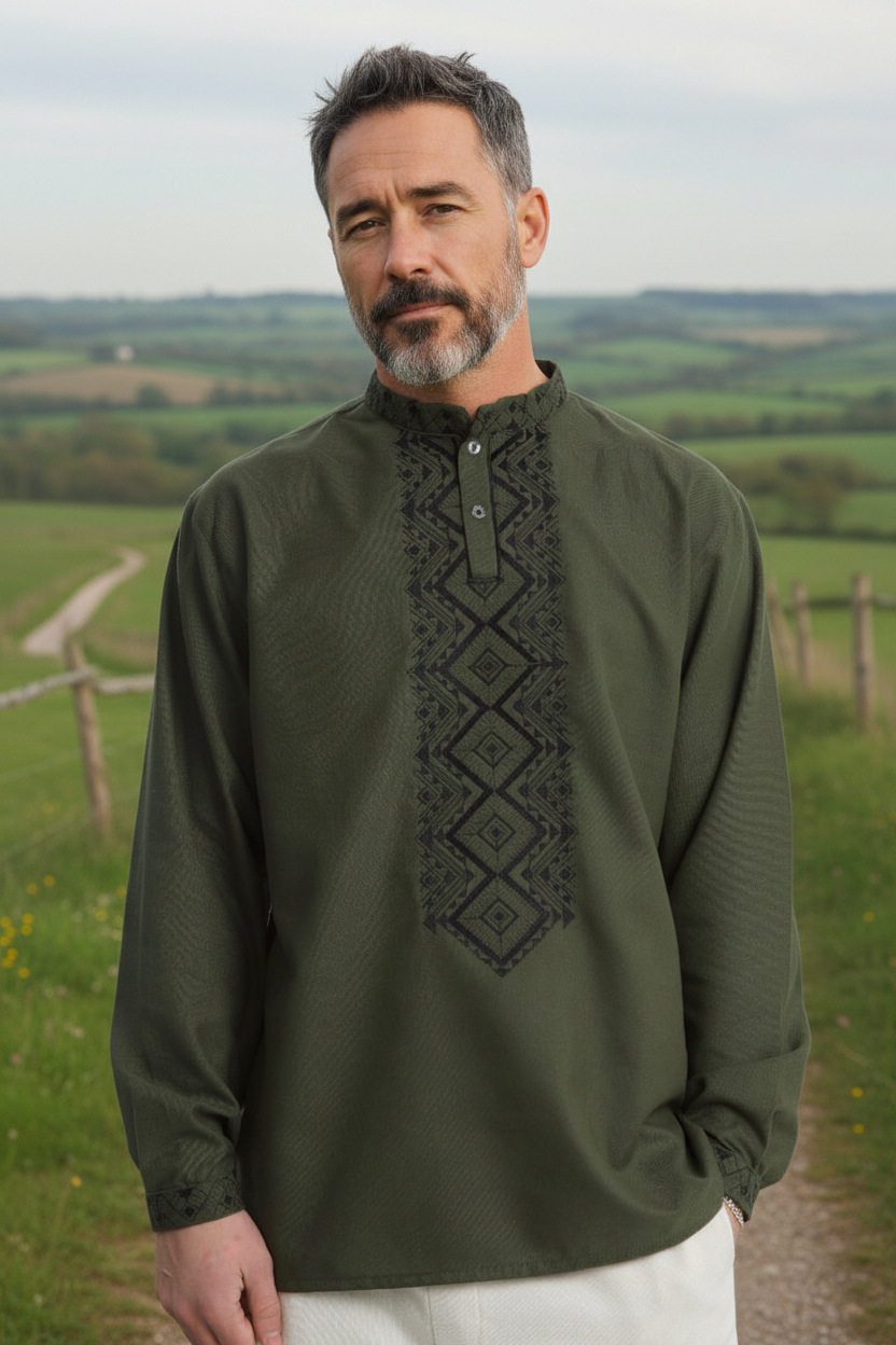 Elegancka koszula męska z pięknym, tradycyjnym haftem, inspirowanym wzorami karpackimi i bieszczadzkimi. Bogate, wzory geometryczne dodają koszuli wyjątkowego charakteru, przywołując na myśl starodawne techniki haftu przekazywane z pokolenia na pokolenie.
